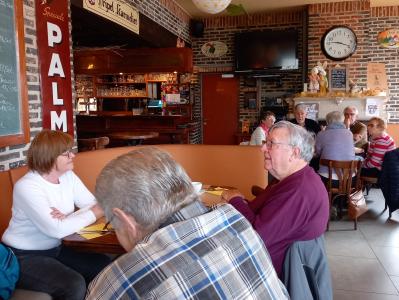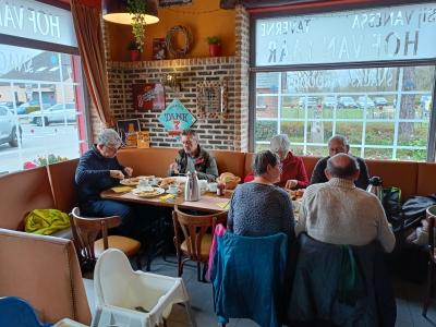 Rond 9u00 terug aan het Hof Van Laar waar we iedereen uitnodigen, ook wie niet deelnam aan de wandeling, om ons 45 jarig bestaan te vieren met een gratis ontbijt met o.a spek met eieren.