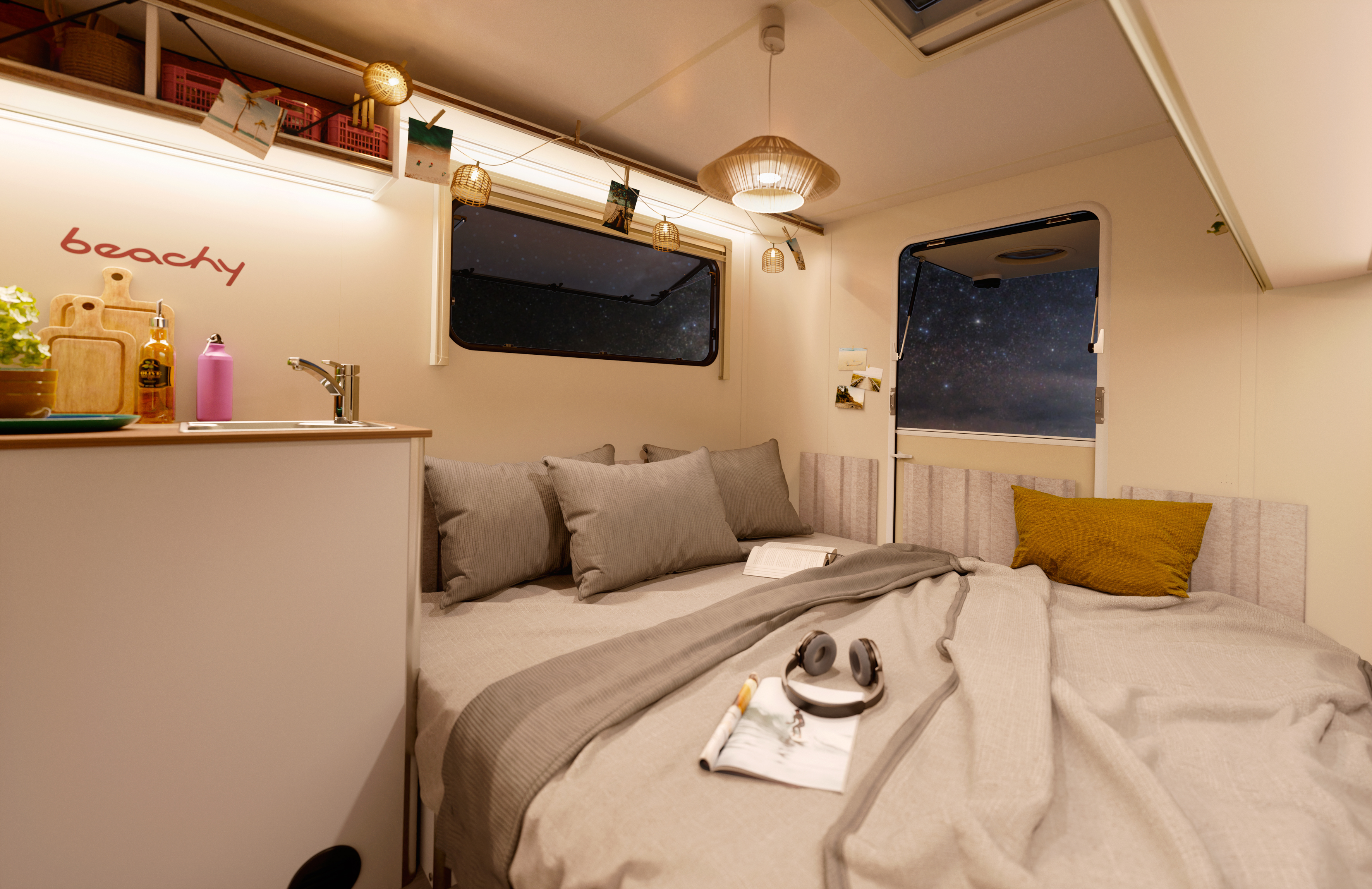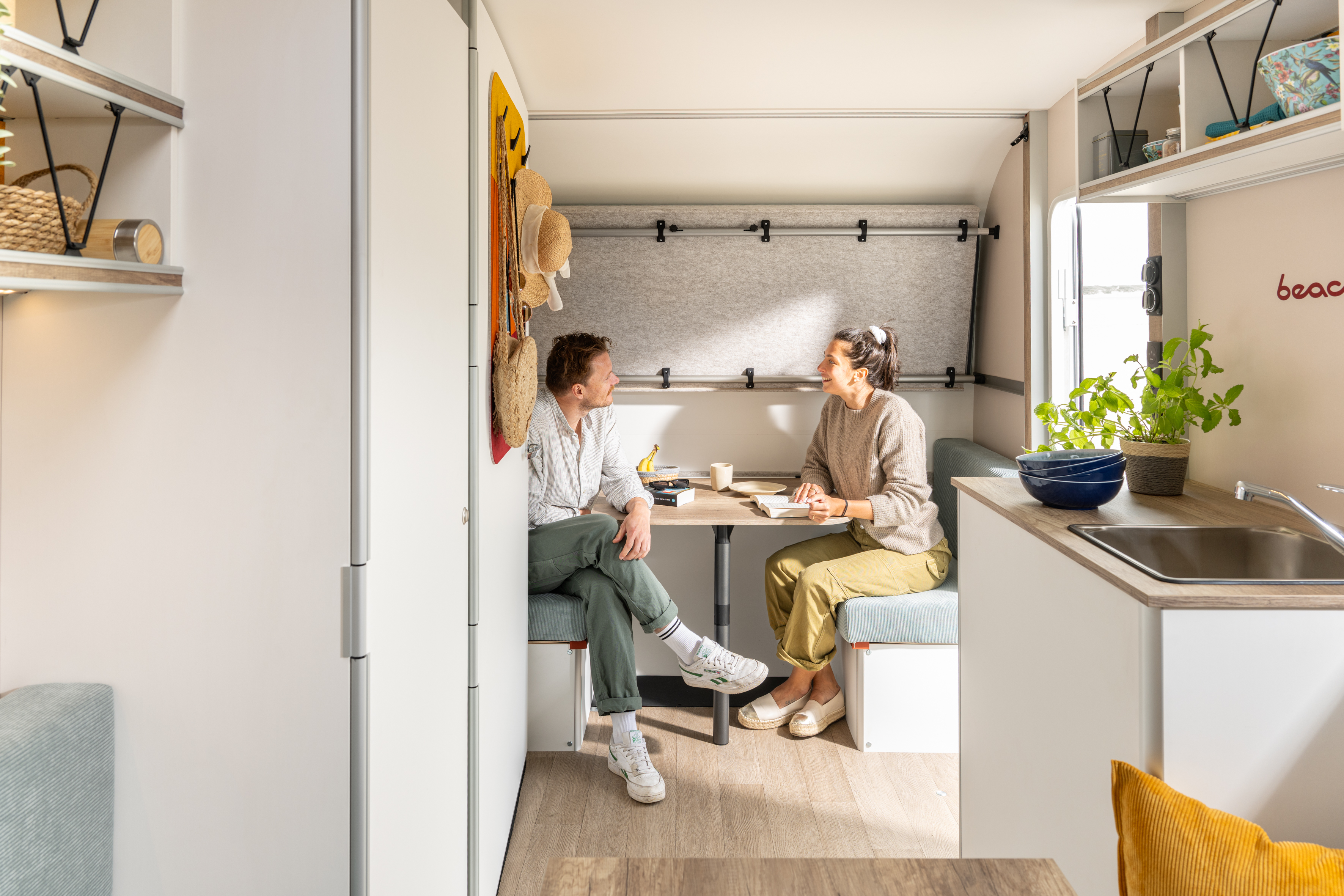 Het model combineert een fris, kleurrijk interieur met een stapelbed voorin, wat het tot een ideale gezinscaravan maakt. Bovendien kan je de ruimte ook omvormen tot een leuke zitbank of een garage. Voor de Beachy 360 tot en met de Beachy 450 blijven bovendien de speciale decal-opties beschikbaar, zodat je je caravan een persoonlijke en speelse uitstraling kan geven.