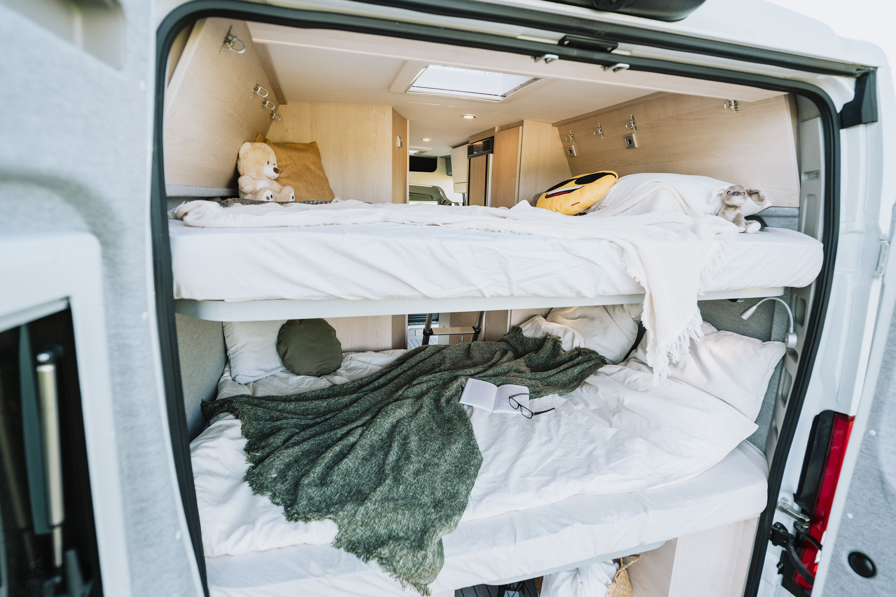 Deze compacte gezinscamper (5,99 m) pakt uit met vier vaste slaapplaatsen dankzij twee dubbele stapelbedden, deels opklapbaar voor extra bergruimte.