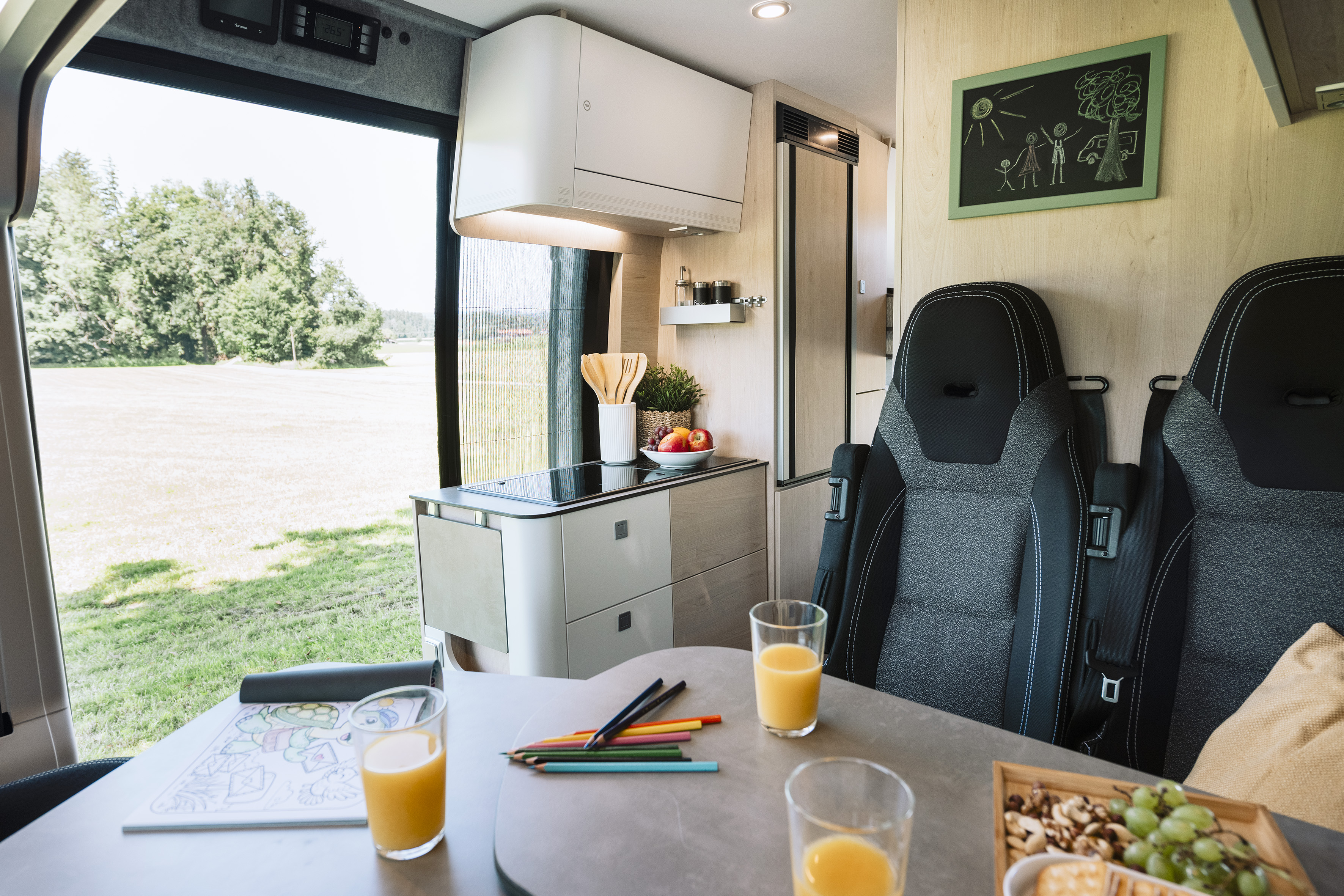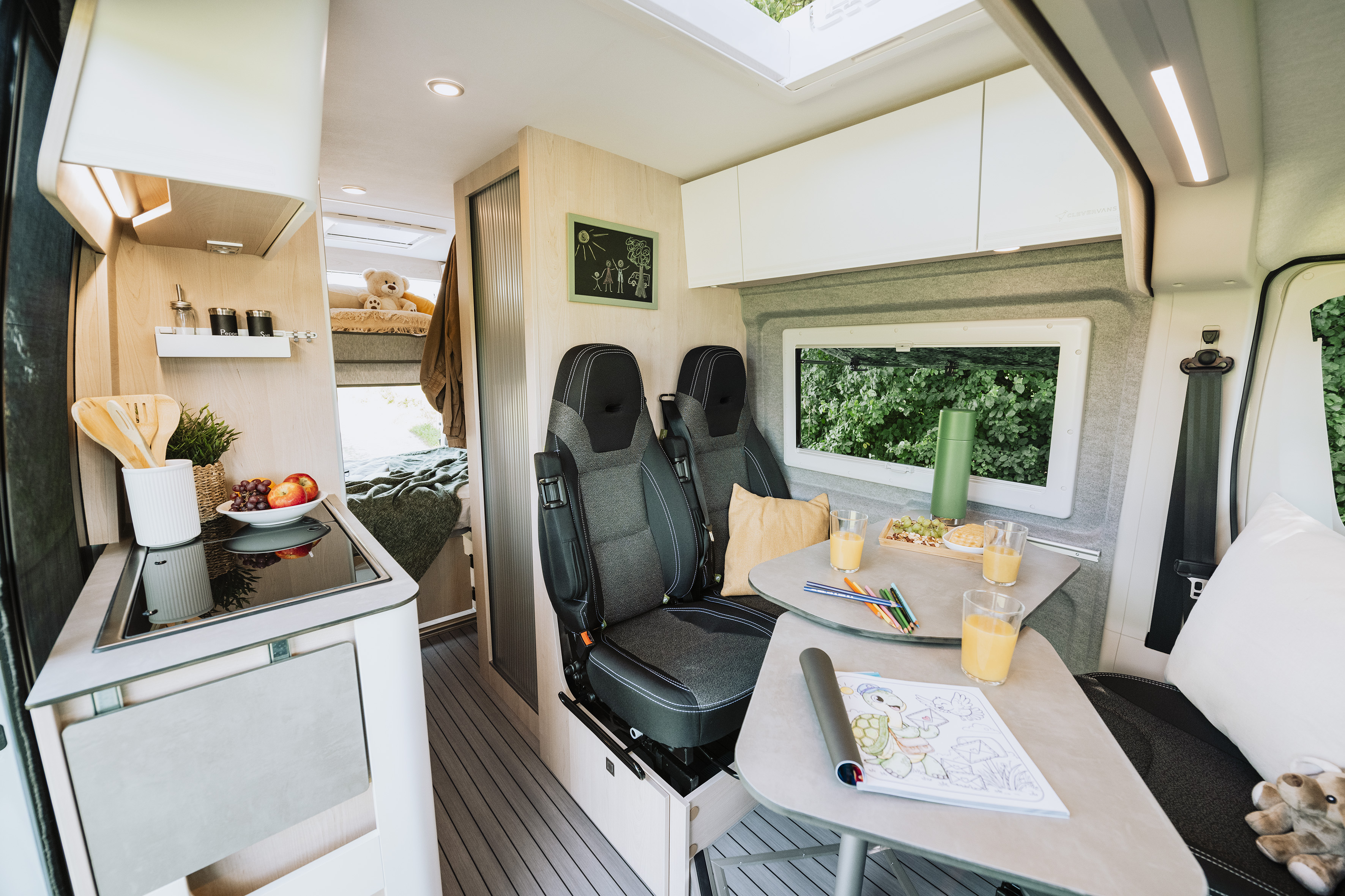 De keuken van de Clever Vans Drive 600 Kids is uitgerust met een tweepits gasfornuis, spoelbak en een 70-liter koelkast met tweezijdige deur. De compacte badkamer combineert toilet, douche en draaibare wasbak in één ruimte. Verwarmen gebeurt via een Truma Combi 4 op diesel. De camper biedt standaard vier zitplaatsen, optioneel vijf slaapplaatsen.