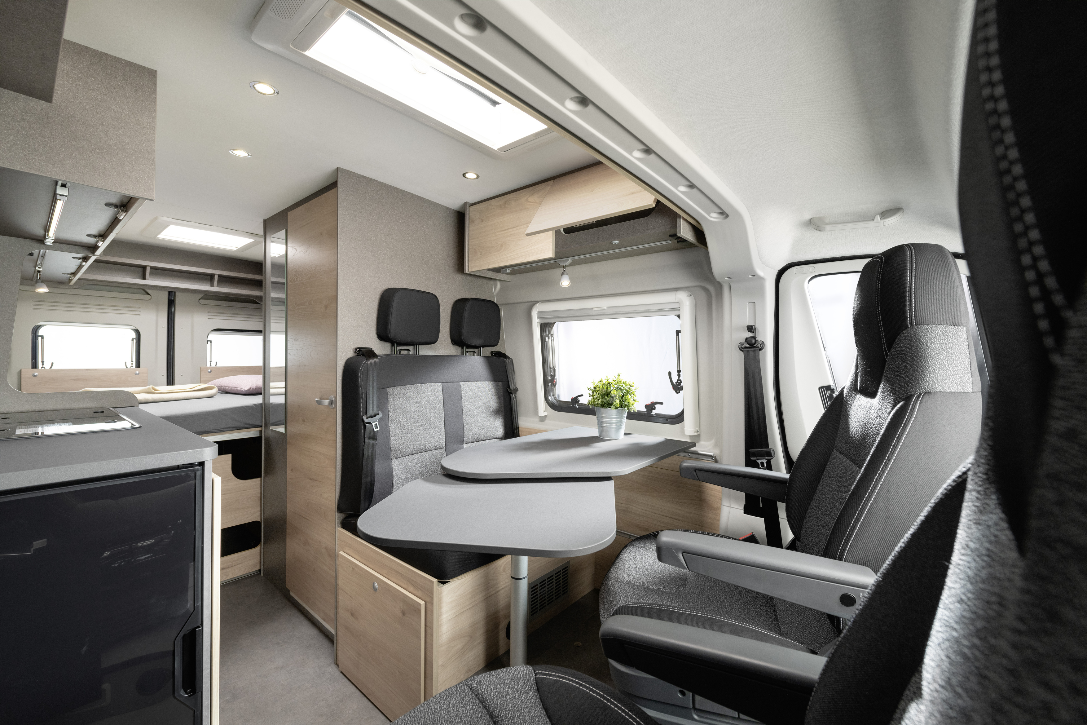 Achterin is een slim opbergsysteem met lades en vakken, terwijl de opstap in de camper ook als opbergruimte dient. Ingebouwde kleerkasten en sfeerverlichting fungeren ‘s avonds als instaplicht. Het innovatieve hefdak zorgt voor een extra slaapplaats met panoramisch uitzicht en muggenhor, ideaal voor gezinnen. Het nachtcomfort wordt versterkt door een hoogwaardige lattenbodem en een 6 cm dik koudschuimmatras. Cabine en woongedeelte zijn voorzien van draaibare stoelen, en de compacte, multifunctionele keukenmodule heeft een uitklapbare kookplaat, spoelbak en extra werkblad onder het aanrecht. Technisch valt de Active op door 16 inch lichtmetalen velgen, achteruitrijcamera, luifel, automatische airco, led-dagrijverlichting, lederen stuur en digitale boordcomputer.