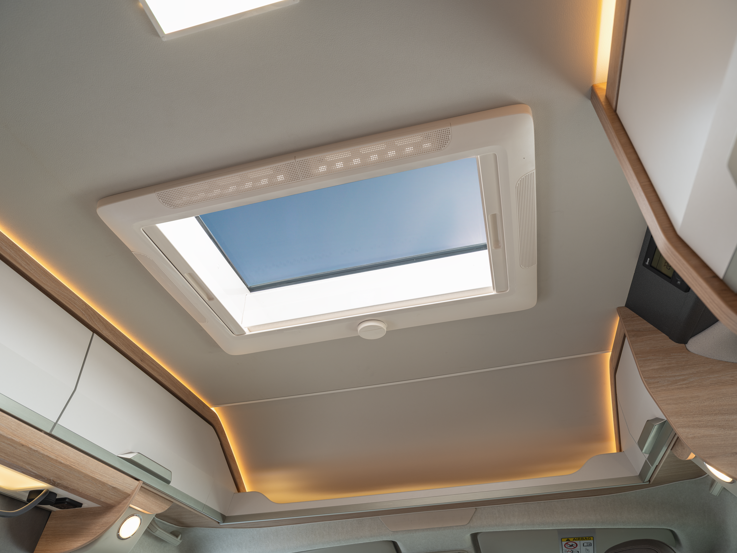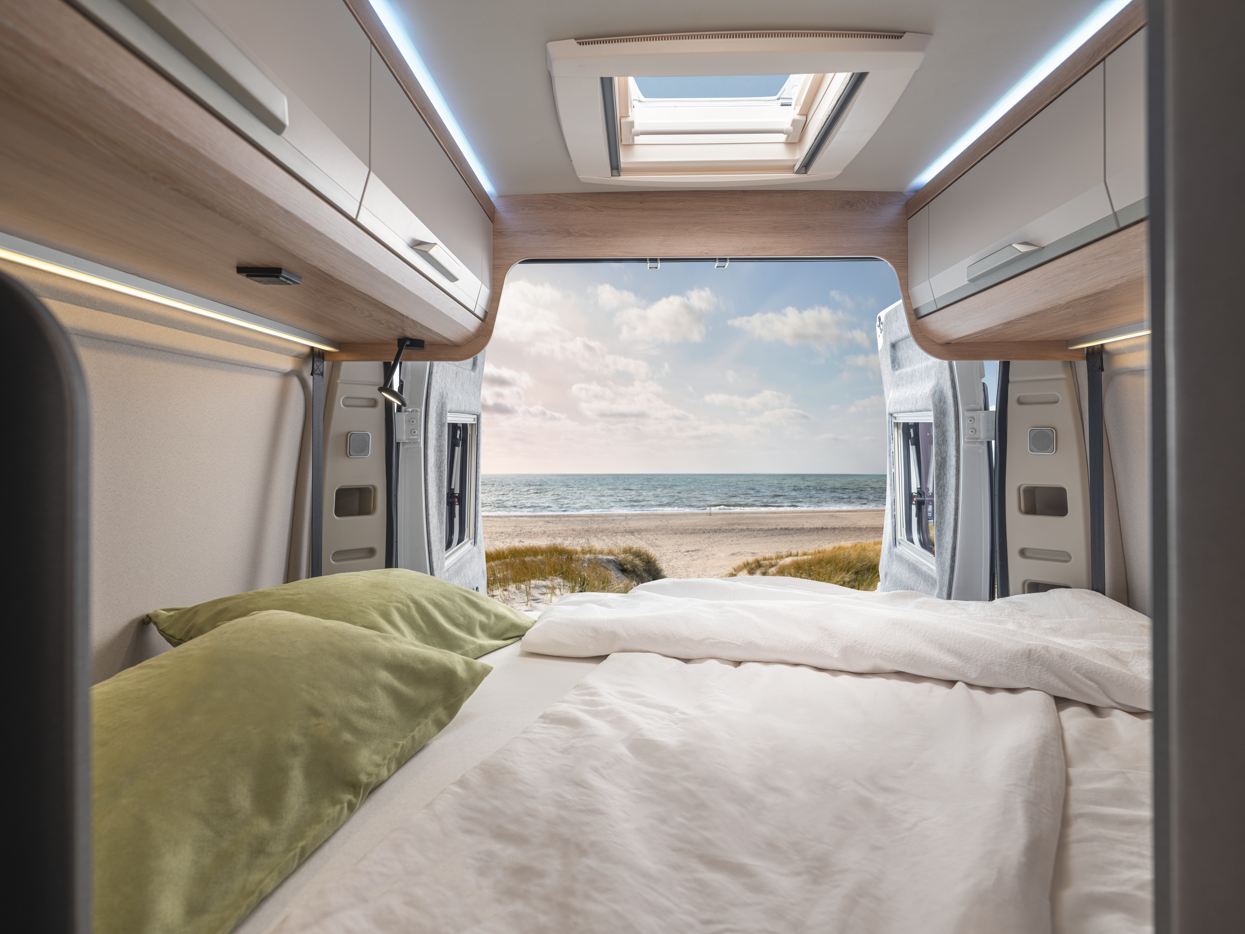 Deze innovatie verlaagt het gewicht met zo’n 60 kg zonder in te boeten op comfort of stevigheid, en vermindert het buitengeluid tot 3 dB(A). Slankere bovenkasten creëren extra bewegingsruimte, vooral tussen keuken en badkamer, terwijl het interieur dankzij het EasySpace-front en panoramaraam open, modern en goed verlicht oogt. De stijlvolle badkamer met draaibare wand heeft luxe sanitaire voorzieningen, het optionele of standaard elektrische hefbed achteraan met verstelbare hoogte heeft een comfortabel matras op schotelveren. De Boxtime is beschikbaar in vier indelingen.