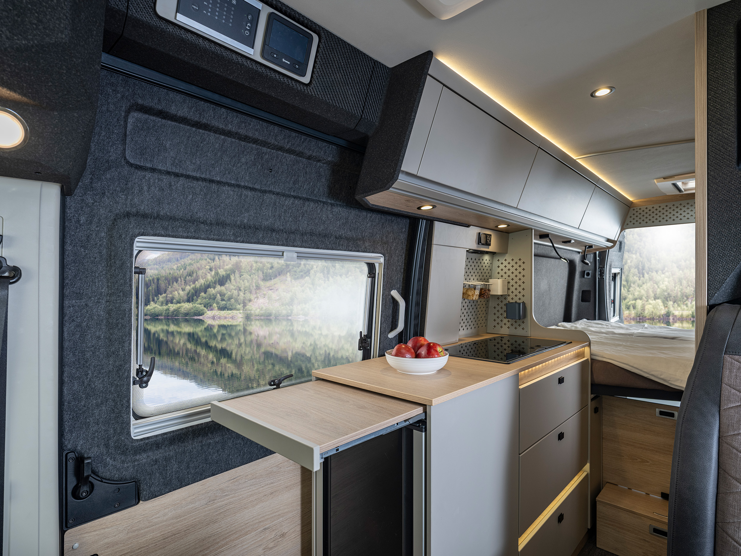 De Boxlife wordt in 2026 nog veelzijdiger. Verkrijgbaar in vijf indelingen, met standaard dieselverwarming en een slimme slide-out zitbank, heeft hij optioneel een hefbed achteraan voor extra bergruimte of een ruim bed. Het badkamerconcept met scharnierende wand zorgt voor een volwaardige douche-ervaring, de keuken heeft over een 2‑pits kookplaat en een optionele koelkast tot 138 liter.