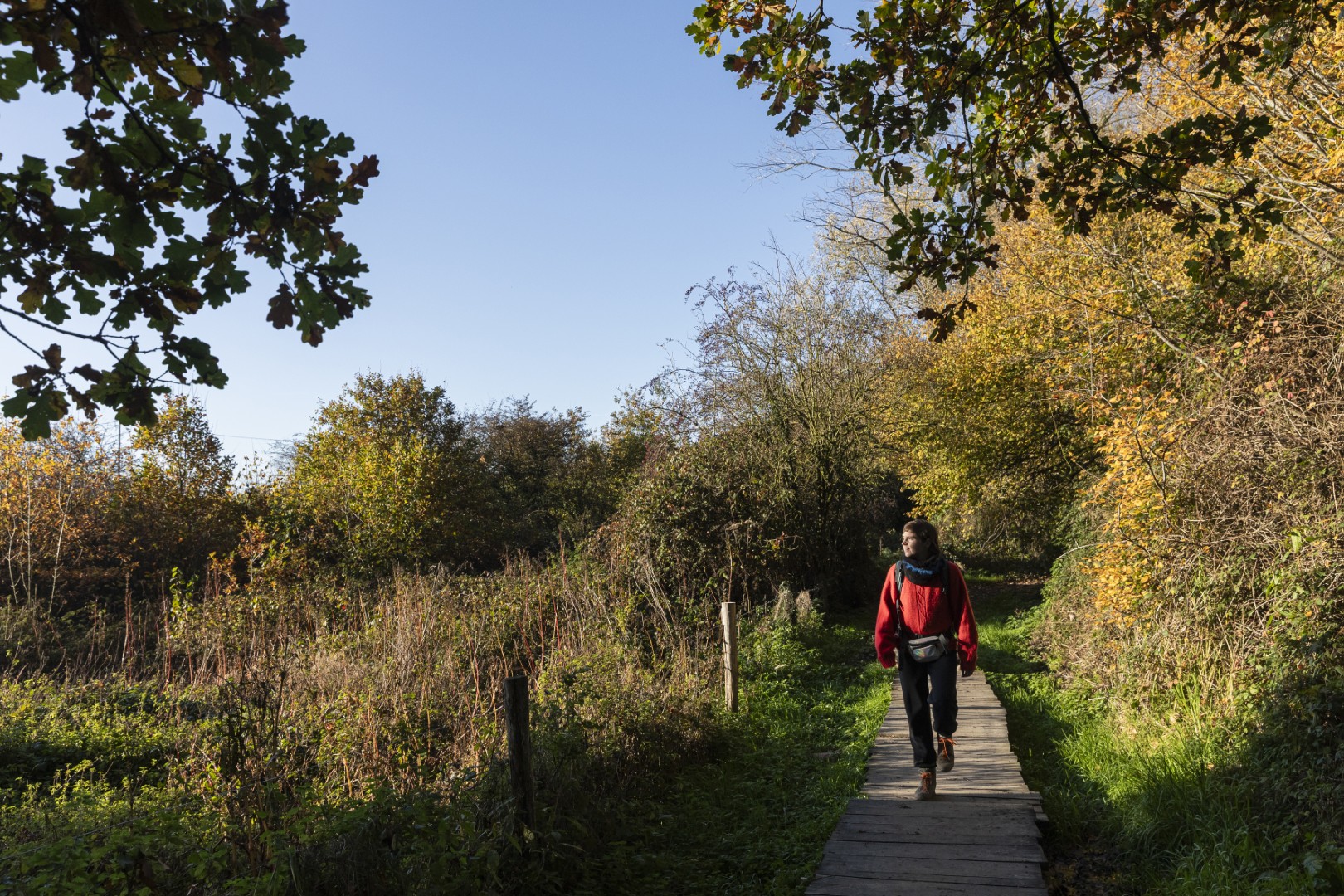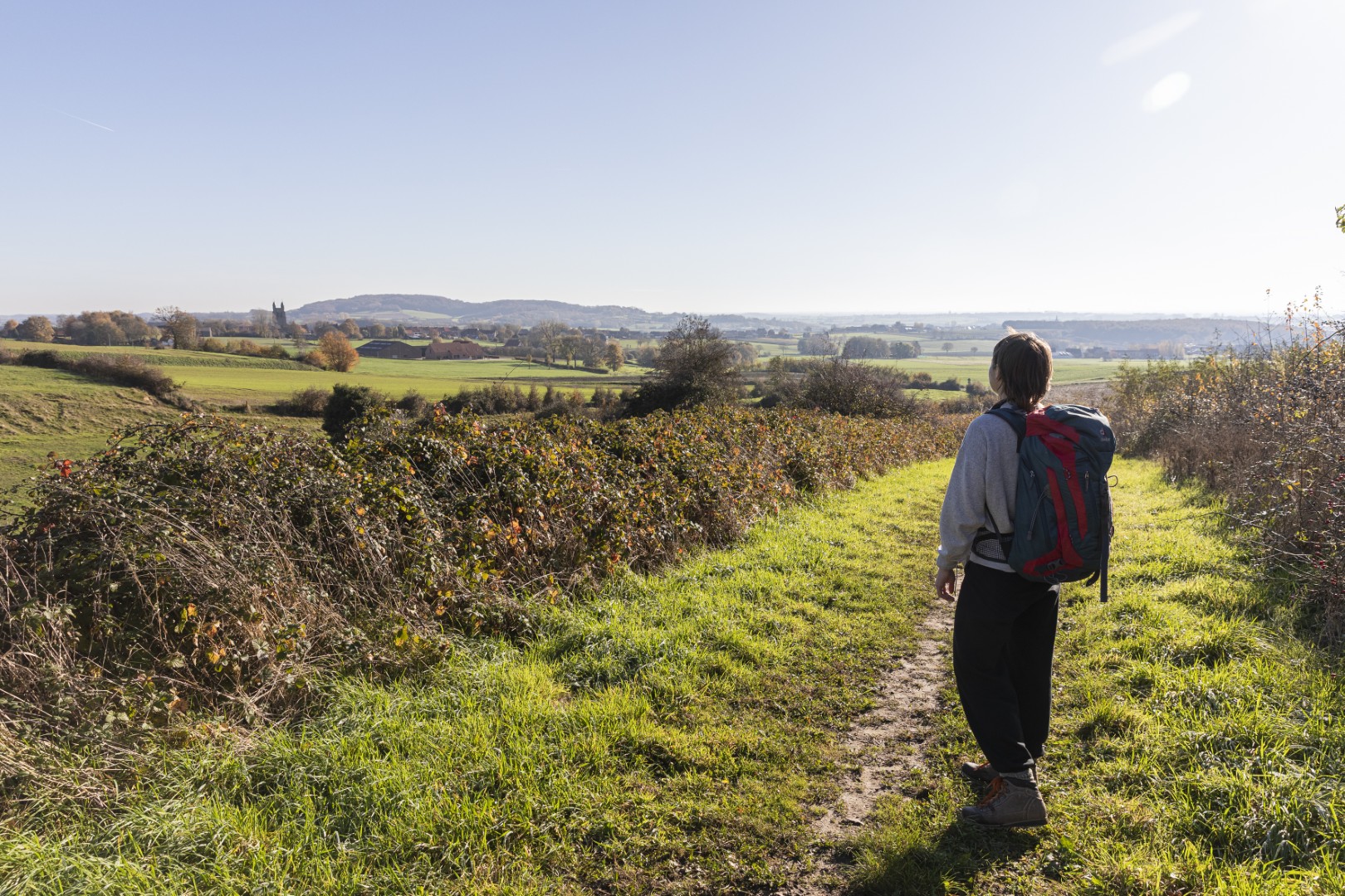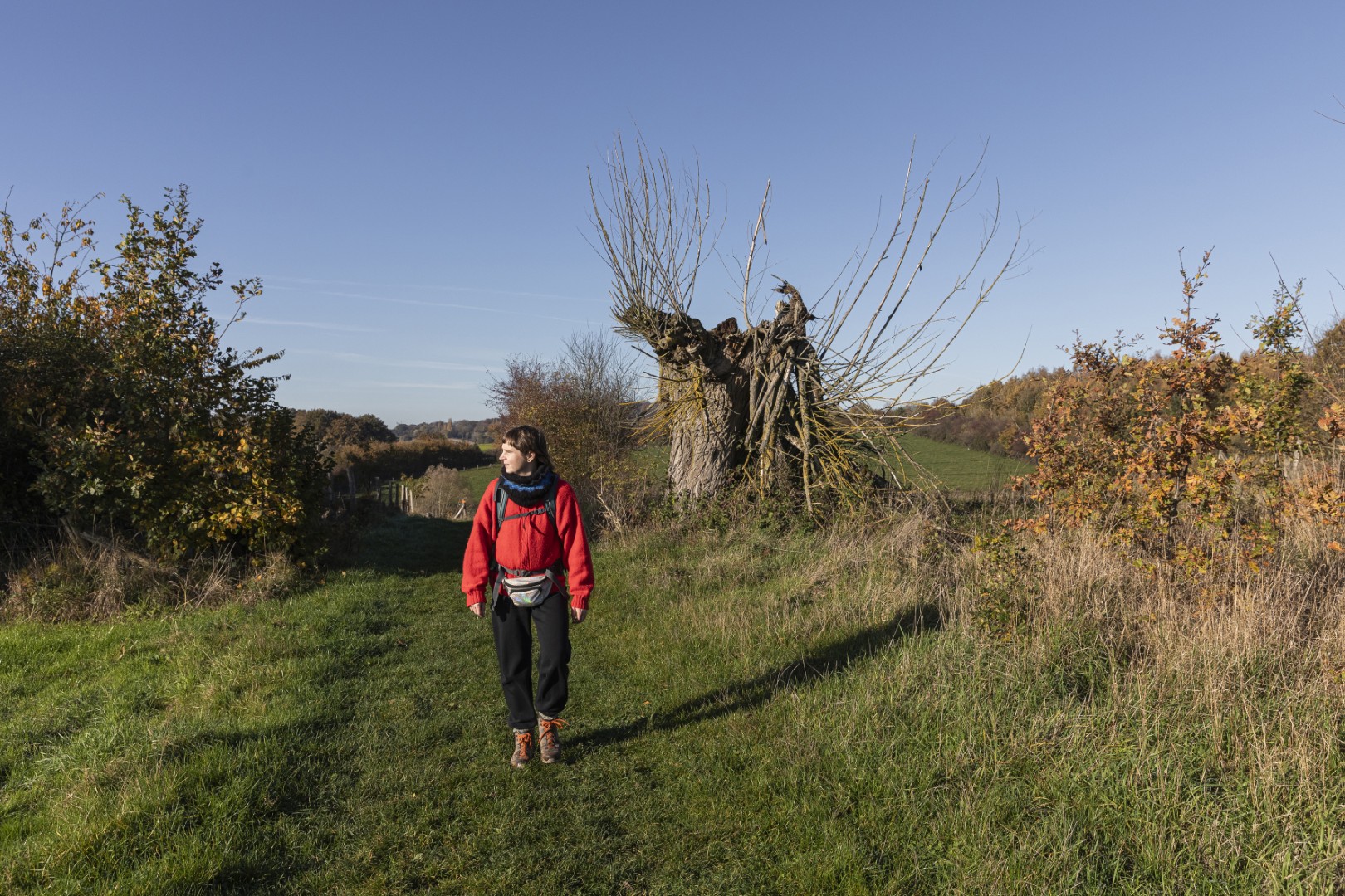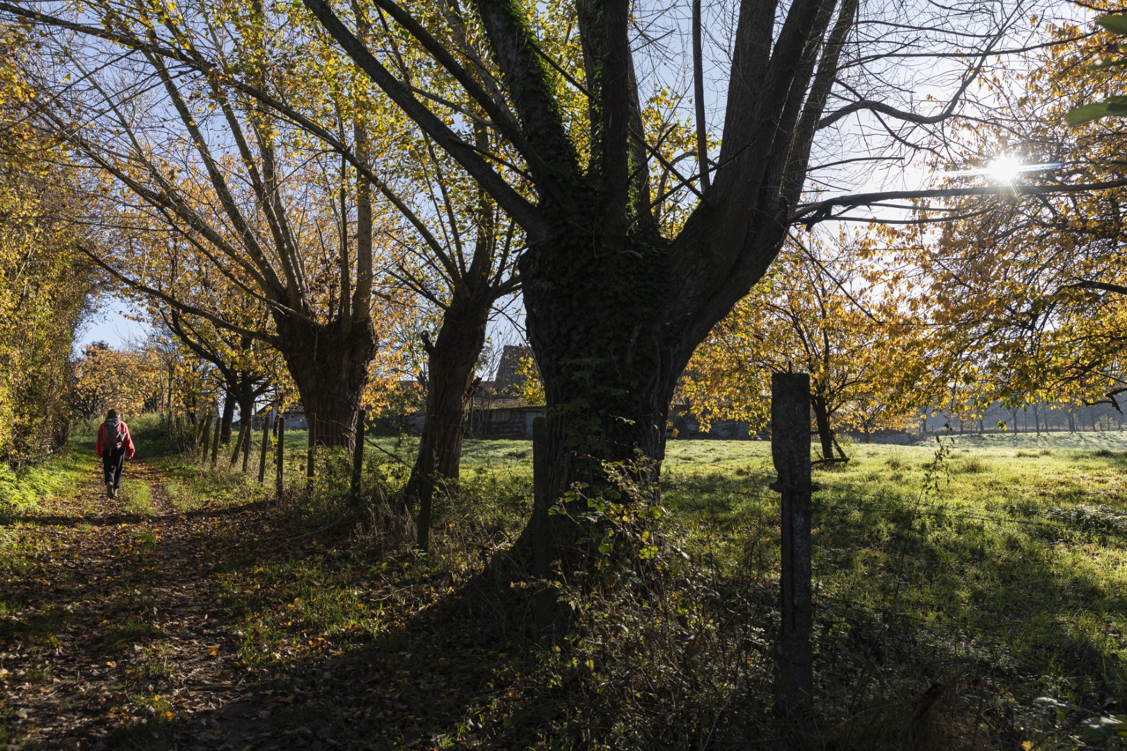 We starten het Stiltepad niet op het officiële startpunt in Westouter, maar in Heuvelland, waar we meteen bergaf wandelen over een hobbelig paadje tussen de bomen. Door de takken en bladeren onthult zich al een stukje van de Douvevallei, met haar glooiende weilanden en knotbomen. De dikste knotwilg van Vlaanderen zou hier staan, lezen we op een infobord. Een kwartiertje later zijn we ver genoeg gestegen om van een prachtig uitzicht te genieten - en dat zal niet de laatste keer zijn. De weidsheid maakt ons stil. Beneden stroomt de Douvebeek, die voor een stukje de grens vormt tussen België en Frankrijk. Want zo ver - of dat is het toch voor dagjesmensen uit Antwerpen - zitten we dus. Onze voeten in de modder op Belgische grond, onze blik op het buitenland. In de verte zien we Bailleul liggen, ook wel ‘Belle’ genoemd, de Franse stad met belfort en klokkentoren van waaruit je ook een prachtig zicht hebt op de Vlaamse heuvels.