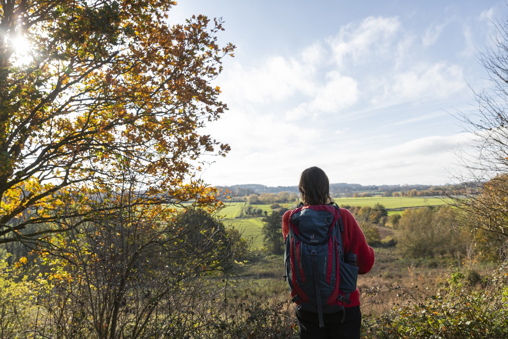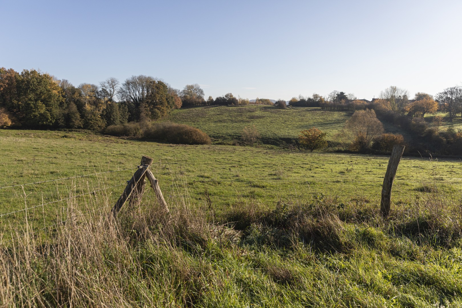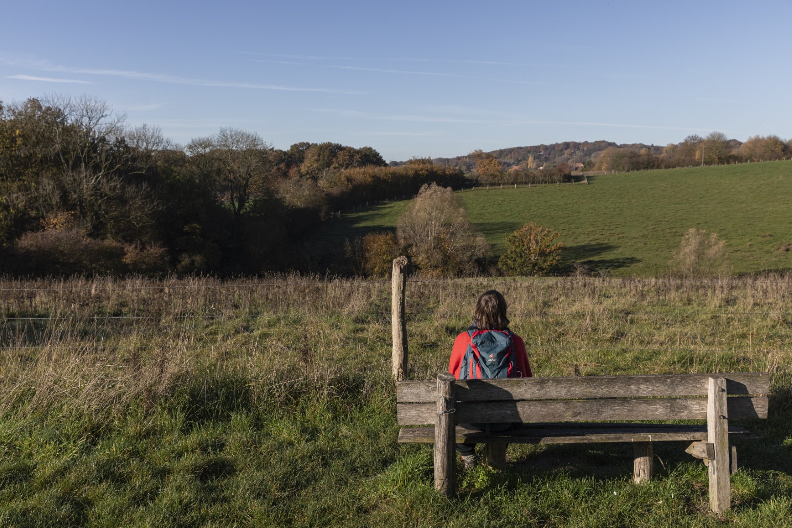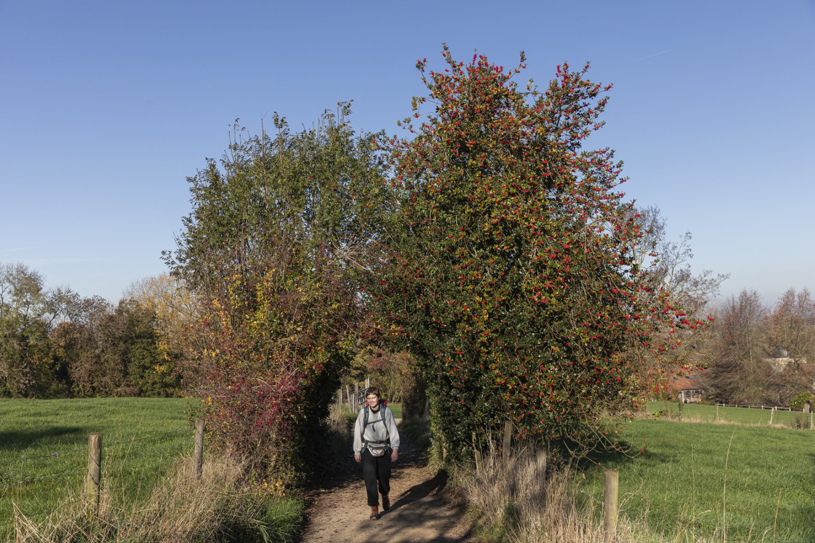 We starten het Stiltepad niet op het officiële startpunt in Westouter, maar in Heuvelland, waar we meteen bergaf wandelen over een hobbelig paadje tussen de bomen. Door de takken en bladeren onthult zich al een stukje van de Douvevallei, met haar glooiende weilanden en knotbomen. De dikste knotwilg van Vlaanderen zou hier staan, lezen we op een infobord. Een kwartiertje later zijn we ver genoeg gestegen om van een prachtig uitzicht te genieten - en dat zal niet de laatste keer zijn. De weidsheid maakt ons stil. Beneden stroomt de Douvebeek, die voor een stukje de grens vormt tussen België en Frankrijk. Want zo ver - of dat is het toch voor dagjesmensen uit Antwerpen - zitten we dus. Onze voeten in de modder op Belgische grond, onze blik op het buitenland. In de verte zien we Bailleul liggen, ook wel ‘Belle’ genoemd, de Franse stad met belfort en klokkentoren van waaruit je ook een prachtig zicht hebt op de Vlaamse heuvels.