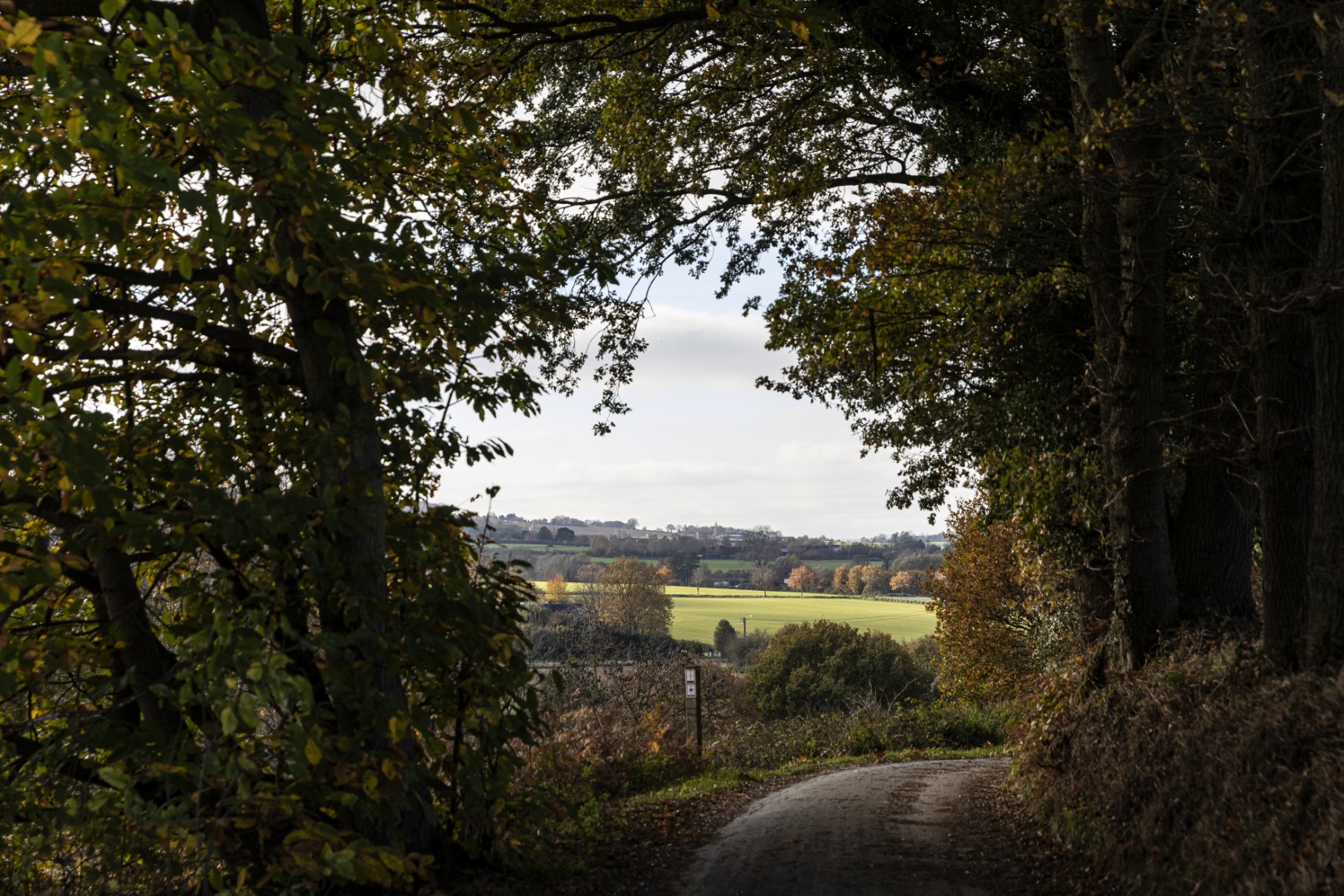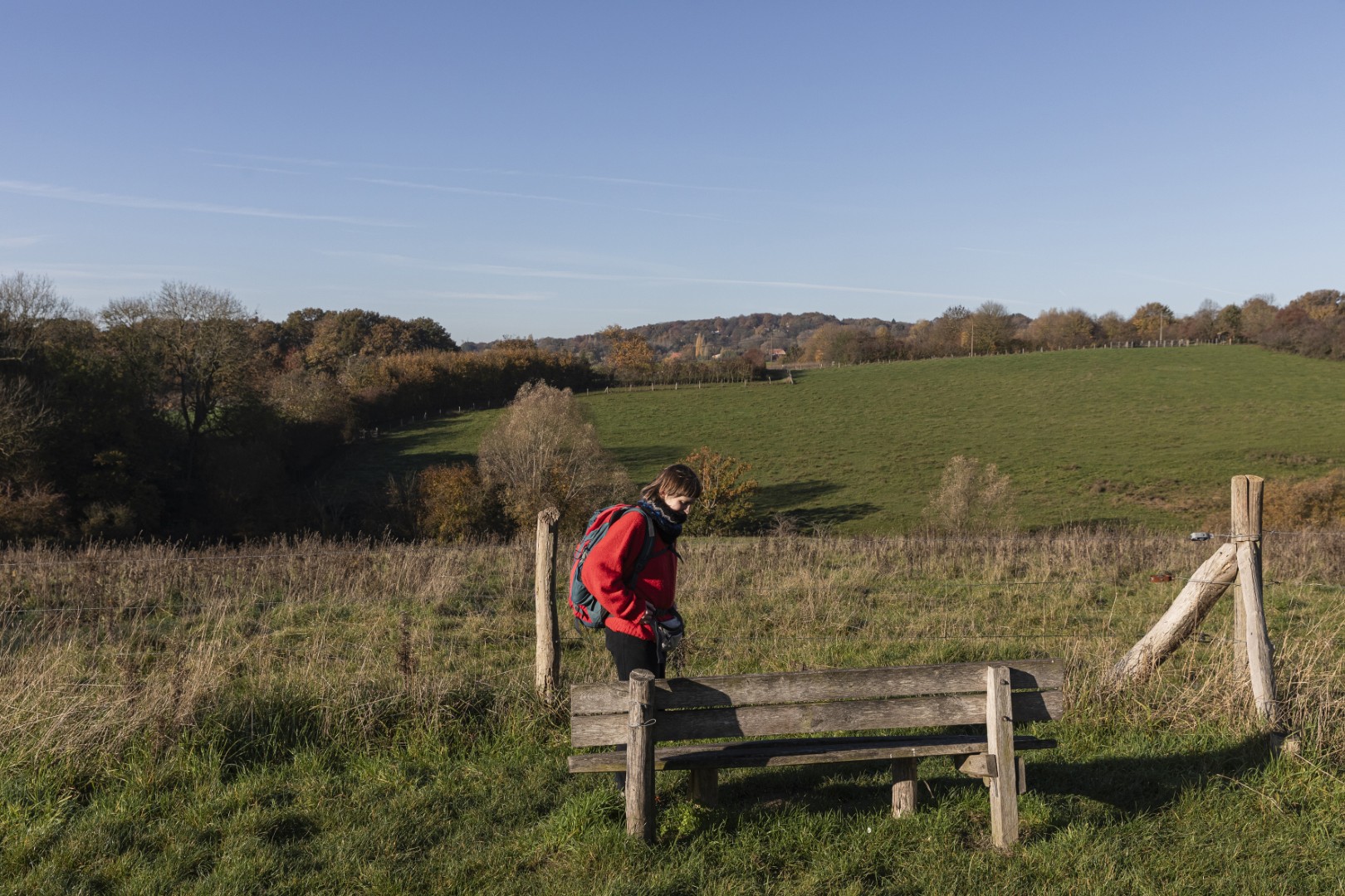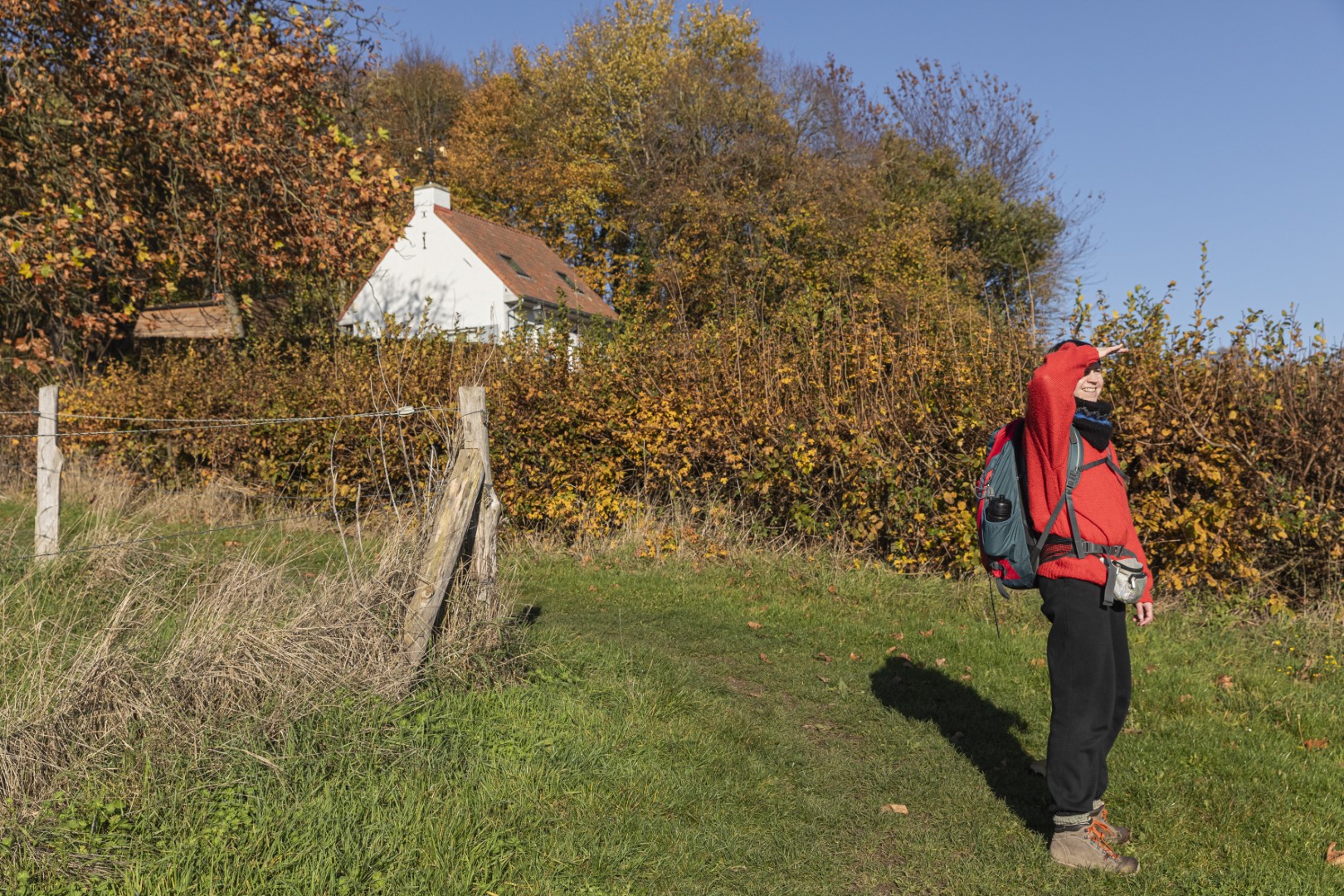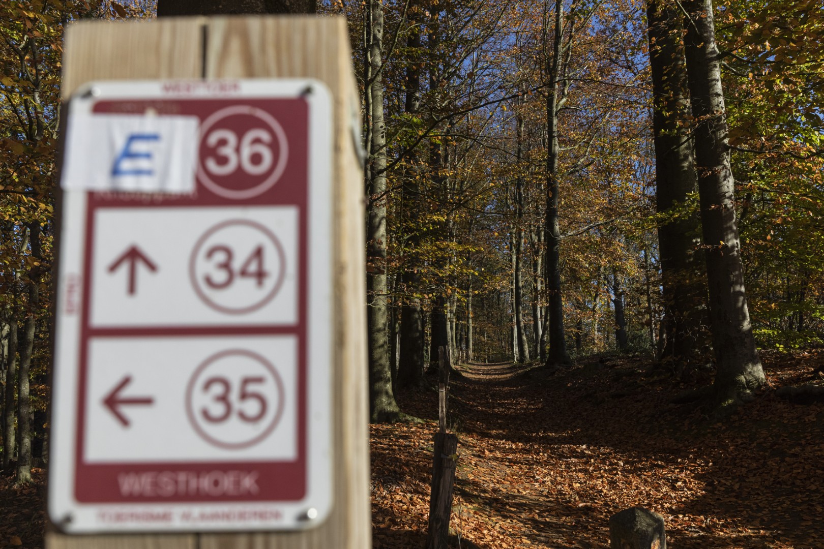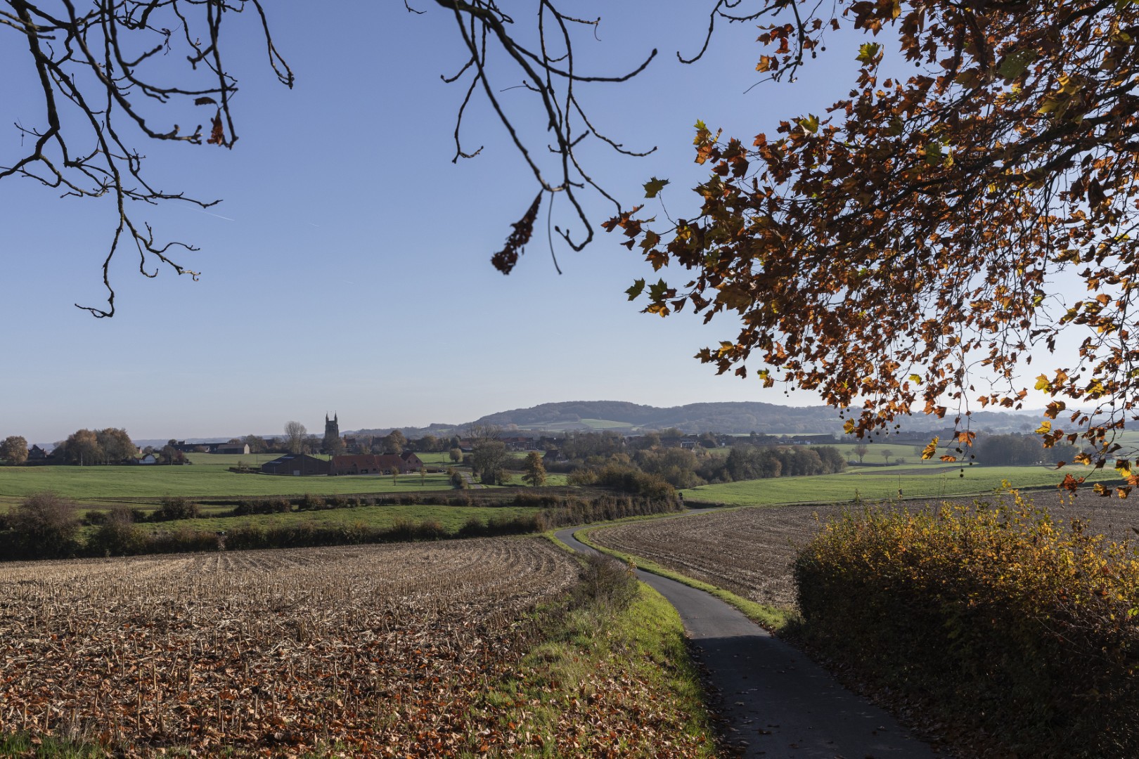 Eerst nog wat bergen beklimmen! En bossen doorkruisen. Het Hellegatbos, op de heuvelflank van de Rodeberg, klinkt duister, maar blijkt vooral bekend om haar speelzones. De naam ‘Hellegat’ verwijst naar een diepe kloof onderaan de heuvelflank, lezen we: het gat onderaan de heuvel of ‘de helle’ in het West-Vlaams. Helaas voor ons dalen we niet echt diep af in ‘de helle’. We snijden ongewild een stukje van de route af - hebben wel al gezegd dat we elke tocht minstens één keer verkeerd lopen? - waardoor we het Hellegatbos maar heel kort aanraken. We zoeken opnieuw aansluiting en zetten onze weg verder richting de Sulferberg. Onderweg genieten we van een schilderachtig tafereel van okerkleurige bomen, groene weilanden en bruine akkers onder een staalblauwe lucht. Twee mountainbikers razen de helling af en vliegen een kiezelpad op. Heuvelland telt verschillende mountainbikeroutes - geen verrassing voor een streek met echte bergen.