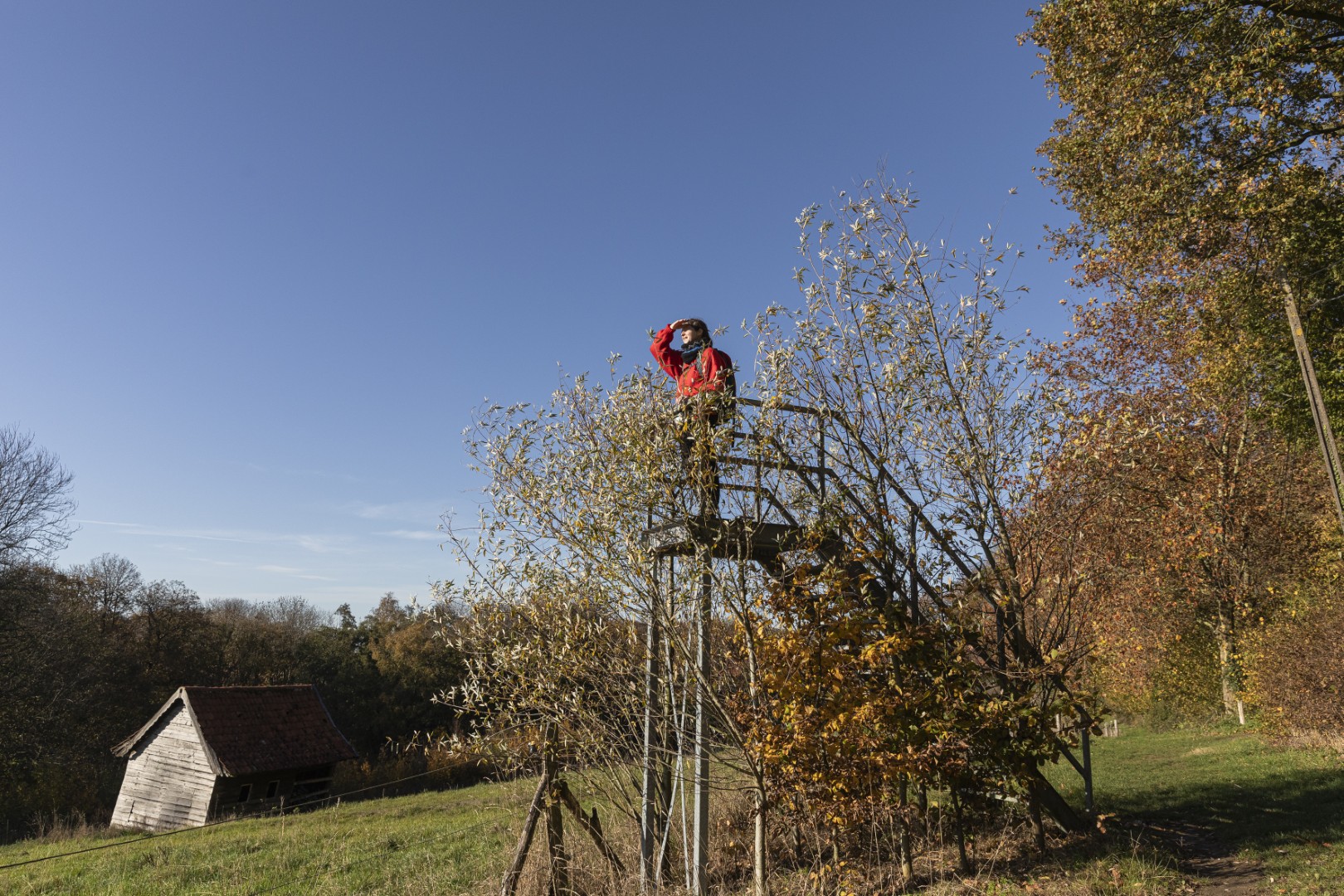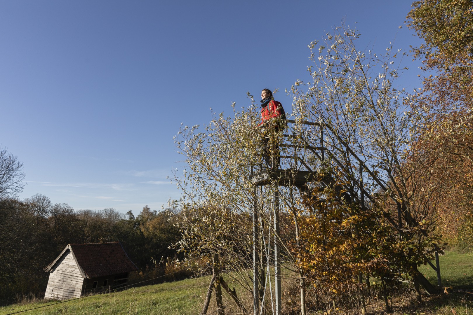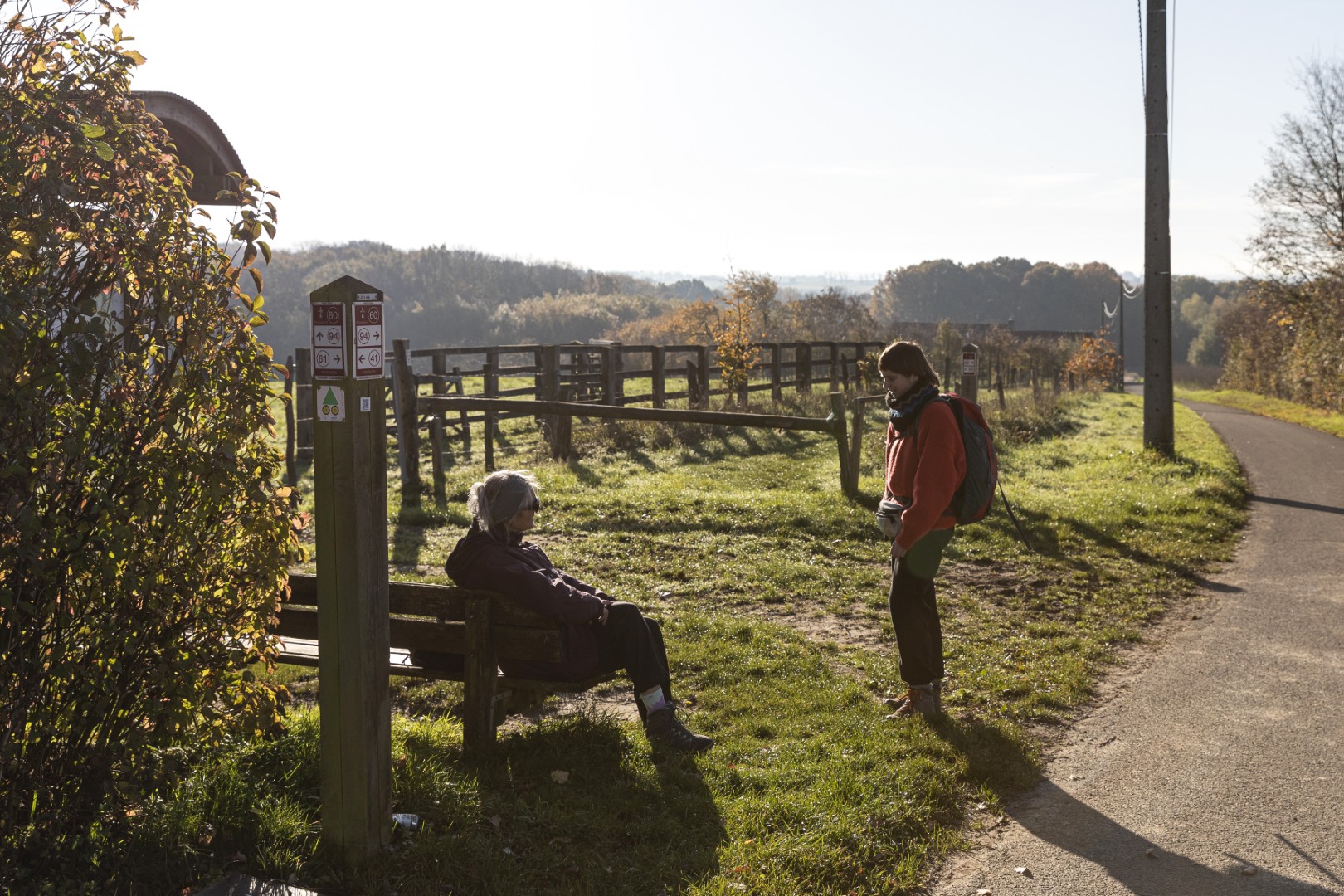 Elk seizoen fluistert op zijn manier over wat tussen bomen leeft. Deze haiku lezen we op een hangmat op de Sulferberg, waar we pauzeren met boterhammen, kaas en een hardgekookt eitje. Het zonlicht valt wondermooi door de halfkale bomen op de met bladeren bedekte grond. We luisteren naar de stilte die op veel andere plekken in Vlaanderen helaas een zeldzaamheid is geworden. Als we terug vertrekken uit het Brandersbos, zoals het bos op de Sulferberg heet, zien we de eerste grote wolken vanuit Frankrijk het land binnen drijven. Het moment dat we Westouter bereiken - na weer een fraai stukje langs velden, poelen en weidse panorama’s - is de lucht meer grijs dan blauw. Ons plan om in Westouter te stoppen voor een warme koffie laten we varen: de kans op regen is groot en we hebben nog wat kilometers te gaan. De bergen van Heuvelland maken plaats voor vlakker terrein, met boerderijen, landweggetjes met stapels suikerbieten, en akkers vol paarse bloemen. Een korte zoektocht online doet ons vermoeden dat het om facelia gaat: een eenjarig plantje dat landbouwers inzaaien als groenbemester om de bodem te verbeteren. Het zorgt alleszins voor het vijfendertigste - we zijn de tel kwijt - mooie zicht van de dag.