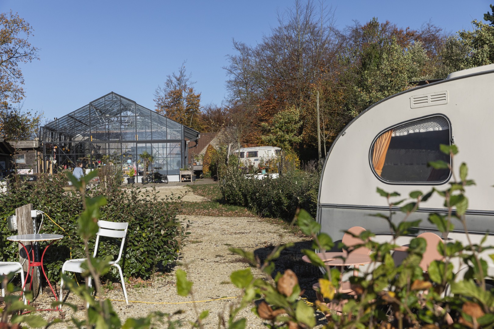 Als je echt in stilte wil wandelen, ga je beter alleen, raadt Geert aan. Vertrek al zeker niet met één van je beste vrienden, zeggen wij. Stappen en zwijgen is lastig voor ons. Het gevóel van stilte waar Geert over spreekt, dat ervaren we gelukkig volledig. Waar we ook stappen, we horen amper storende geluiden. Geen geraas van doorgaand verkeer kilometers verderop, geen snelwegen in de dichte omgeving. We kruisen amper één of twee grote wegen, waarover geen enkele auto rijdt, en begrijpen waarom in dit verre stukje Vlaanderen een Stiltepad ligt. We maken ook meteen plannen om eens naar De Nachtegaal te komen, de minicamping boven op de Rodeberg waar de route langs loopt. De retro caravans waarin je hier kan overnachten, staan te blinken in de zon. Wie hier kampeert, krijgt er gratis en voor niks een geweldig uitzicht over het Heuvelland bij. De grote serre op het terrein - met zitplek, pelletkachel, veldkeuken en spelletjes - lijkt ons nu al de ideale plek voor een uurtje lezen terwijl het buiten regent. In de bijhorende brasserie aan de straatkant willen we dan weer absoluut een pannenkoek gaan eten - maar dat is voor straks.