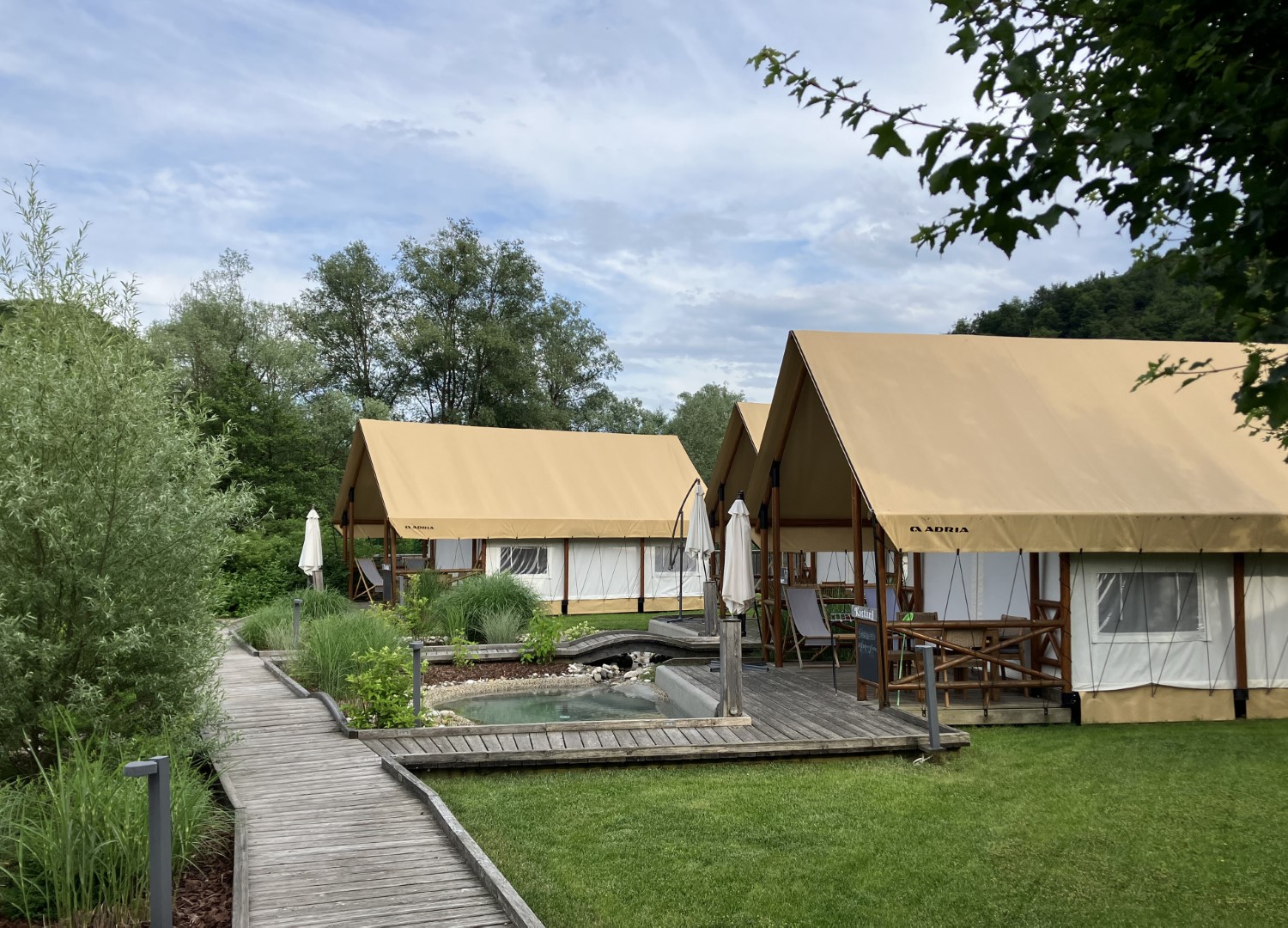 In Podčetrtek ploffen we neer op het king-sizebed van een superdeluxe tent op Glamping Olimia Adria Village. Eigen keuken, badkamer, terras, elke ochtend ontbijt op een privé-terras vanwaar ik me als een pasja het water in laat glijden. Wat voor een bofkont kan je zijn? Maar tegen het ochtendgloren schuifelt een goederentrein loom achter het hoge houten hek van de village voorbij. Vandaar die oordopjes op het nachtkastje.