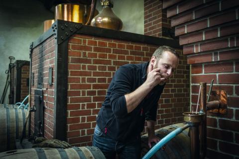 Maar Jean-Roger geniet ook van zijn werk. ‘Vooral als ik calvados stook in de winter. Onze koperen distilleerketels werken nog met een houtvuur. Buiten is het koud en donker, binnen hangt een bijzondere sfeer. Ik kan me dan een alchemist voelen die cider verandert in vloeibaar goud.’ Alles verloopt traag en artisanaal bij Calvados Roger Groult, maar daarom niet minder doelgericht en nauwkeurig.