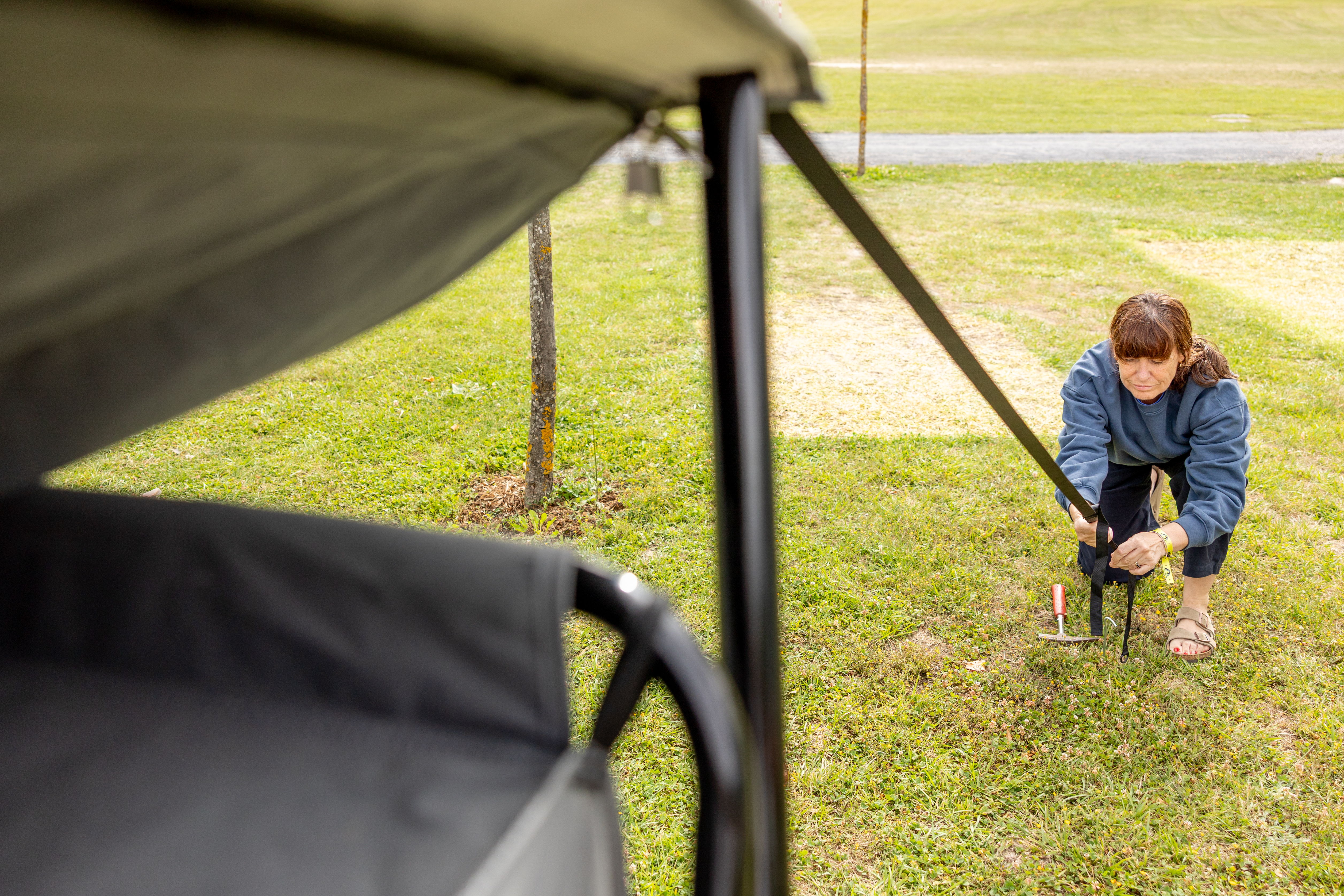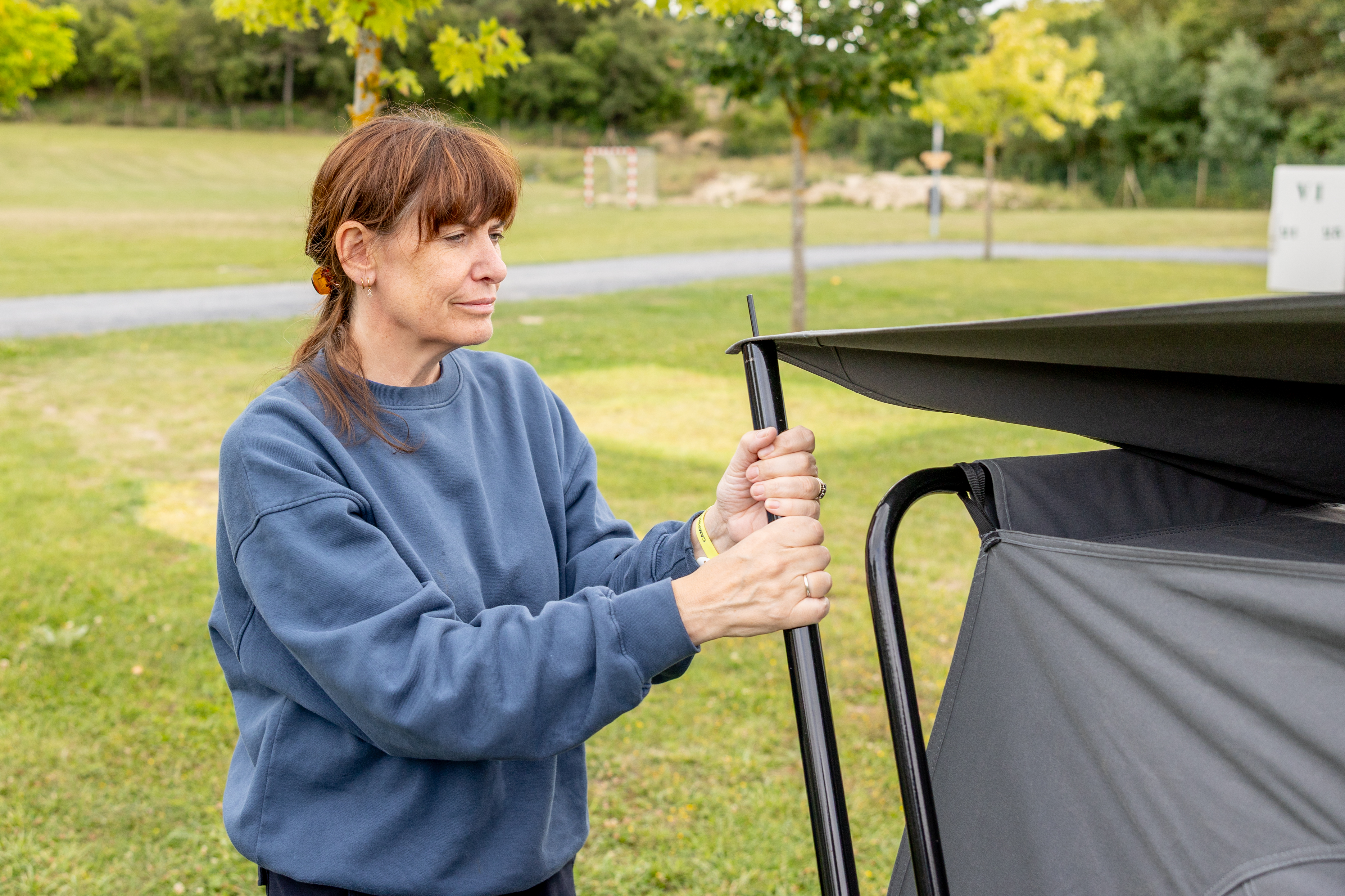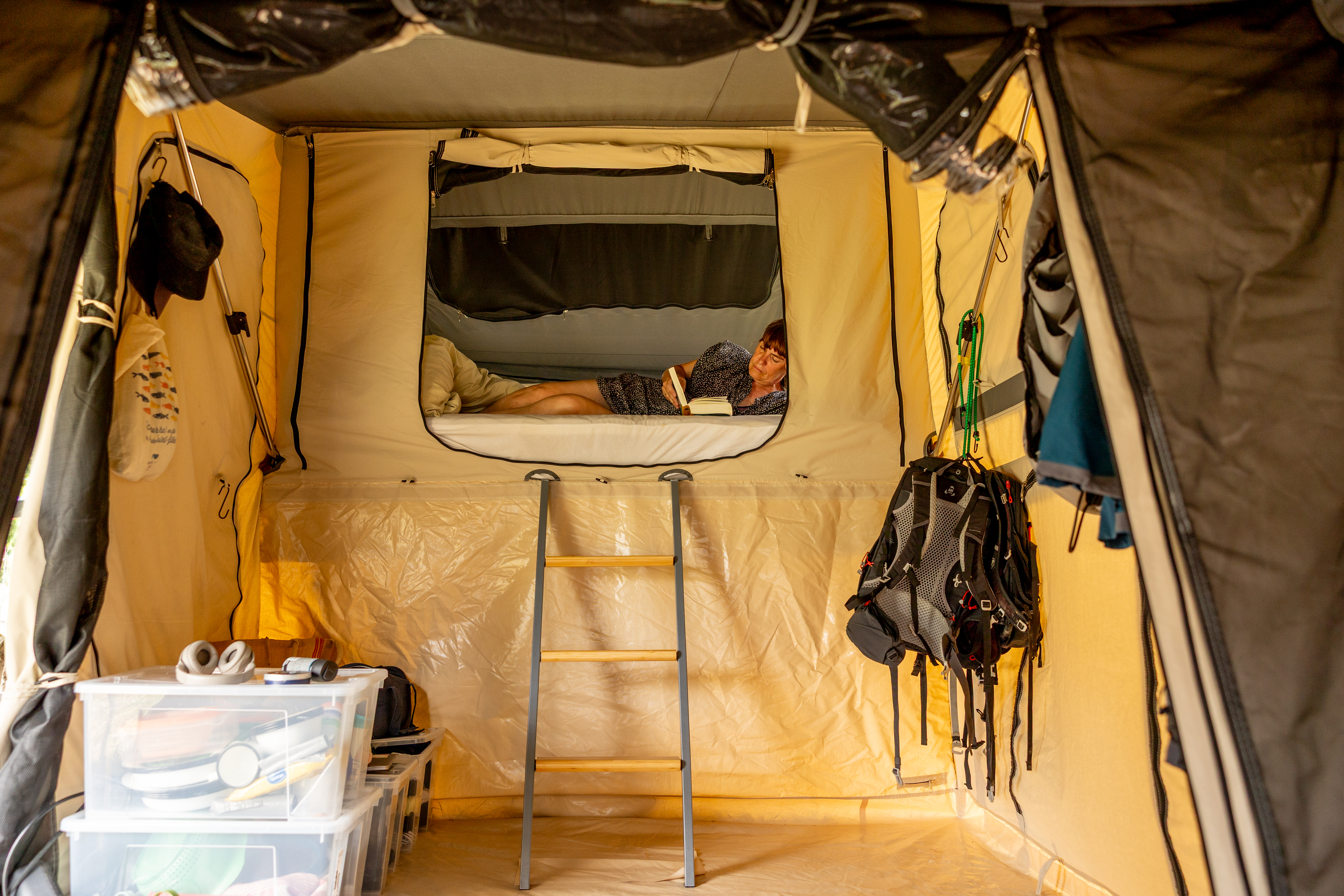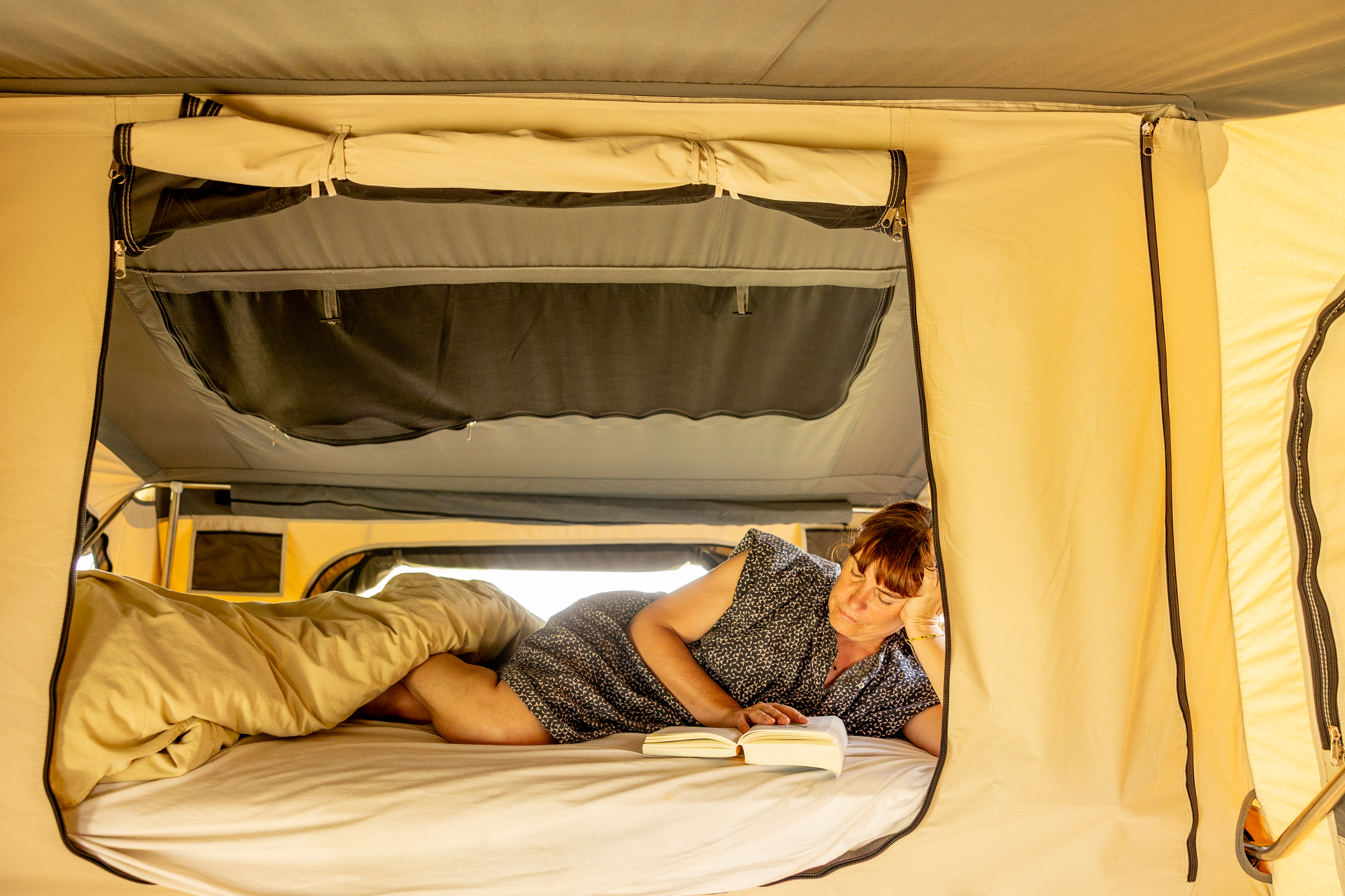 Het slaapgedeelte verdient een aparte vermelding. Wie ooit in een klassieke tent op een opblaasmatje heeft gelegen, weet wat het betekent om een nacht lang te schuiven, te draaien, te zuchten en met kramp in de heupen wakker te worden. Hier dus niet. De Lazy Jack heeft een kingsize bed, bovenop de aanhangwagen, bereikbaar via een laddertje, met een echte pocketveringmatras. Niet zo’n sponsding waar je rug een afdruk in achterlaat, maar een stevig, ventilerend geval waar je effectief goed op slaapt. En dan is er nog een tweede slaapcabine, ook ruim en voorzien van zelfopblazende matten, waar volwassen kinderen, koppels of logés even goed slapen als thuis, of beter, als ik mijn nazaten mag geloven. Binnenin is alles slim opgevat. Je hebt ruimte, echte ruimte, om recht te staan, en ik ben twee meter, om je om te kleden zonder acrobatie, om spullen op te bergen zonder je zaklamp tussen je tanden te klemmen. Alles ademt doordachtheid, ripstop katoen dat degelijk aanvoelt, ramen met muskietengaas, ventilatieopeningen op de juiste plekken, en vooral: je kan elk raam openzetten. Niet een kier, niet half, maar echt open. En dat zorgt voor iets wat in veel caravans een vaag verlangen blijft: lucht. Zachte, stromende lucht die binnenkomt zonder insecten, zonder gedoe. Ventilatie zoals het hoort, en een gevoel van degelijkheid dat je eerder verwacht bij Scandinavisch meubilair dan op een camping in Noord-Spanje. De voortent, die je optioneel kunt uitbreiden, is geen doek aan wat stokken maar een volwaardige leefruimte, stevig, windvast en hoog genoeg om er zelfs met slecht weer comfortabel in te zitten. Ook over het onderstel is nagedacht, een stalen chassis, degelijke scharnieren, stevige banden en het Easy Load systeem waarmee je de vouwwagen kunt inladen terwijl hij nog dicht is. En dat voel je onderweg. De Lazy Jack ligt als een blok achter de auto, geen geslinger, geen aanzuigeffect van vrachtwagens, geen gedoe, je voelt hem nauwelijks, en dat, als je elektrisch rijdt met een volle auto, is niet zomaar een pluspunt, dat is essentieel.