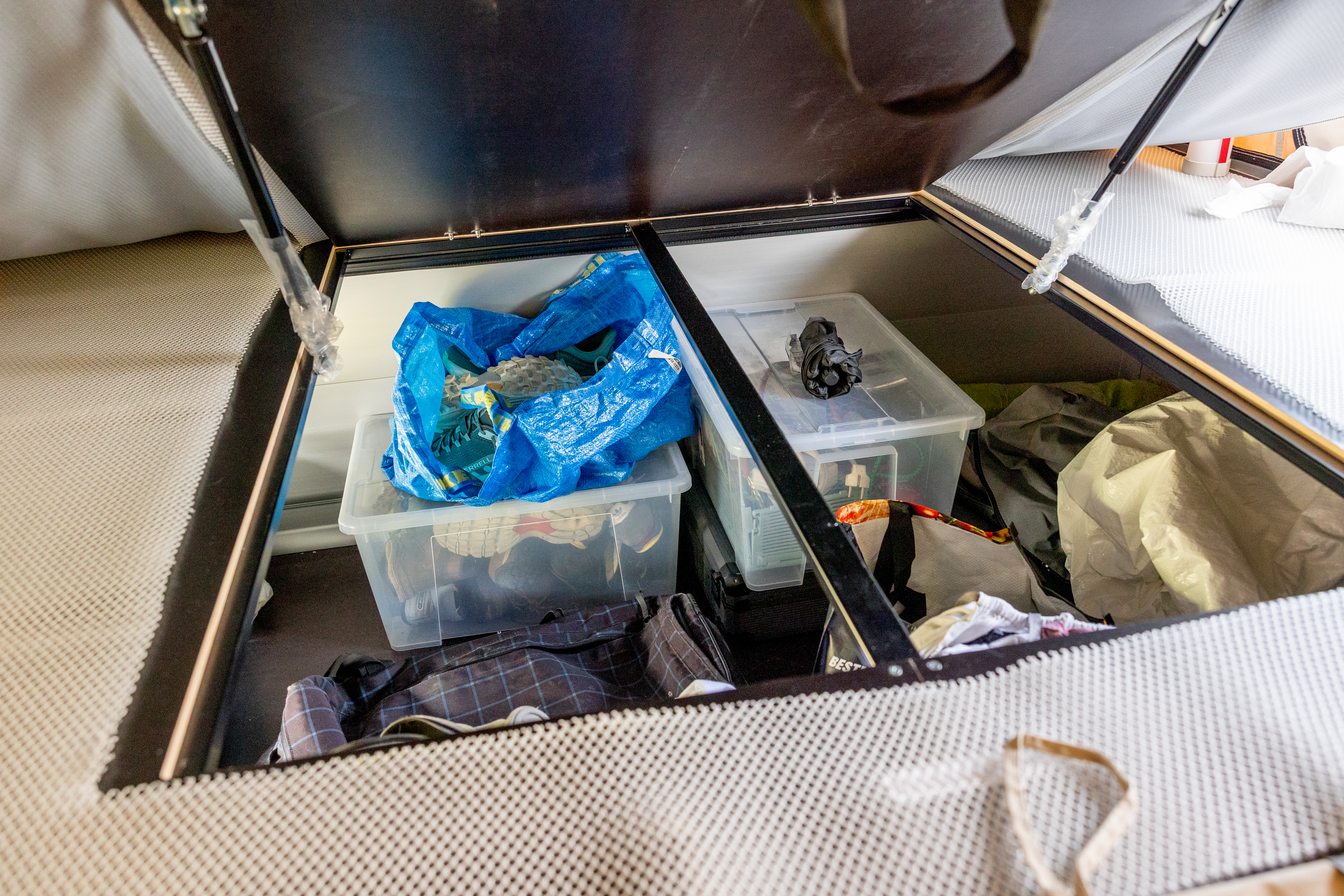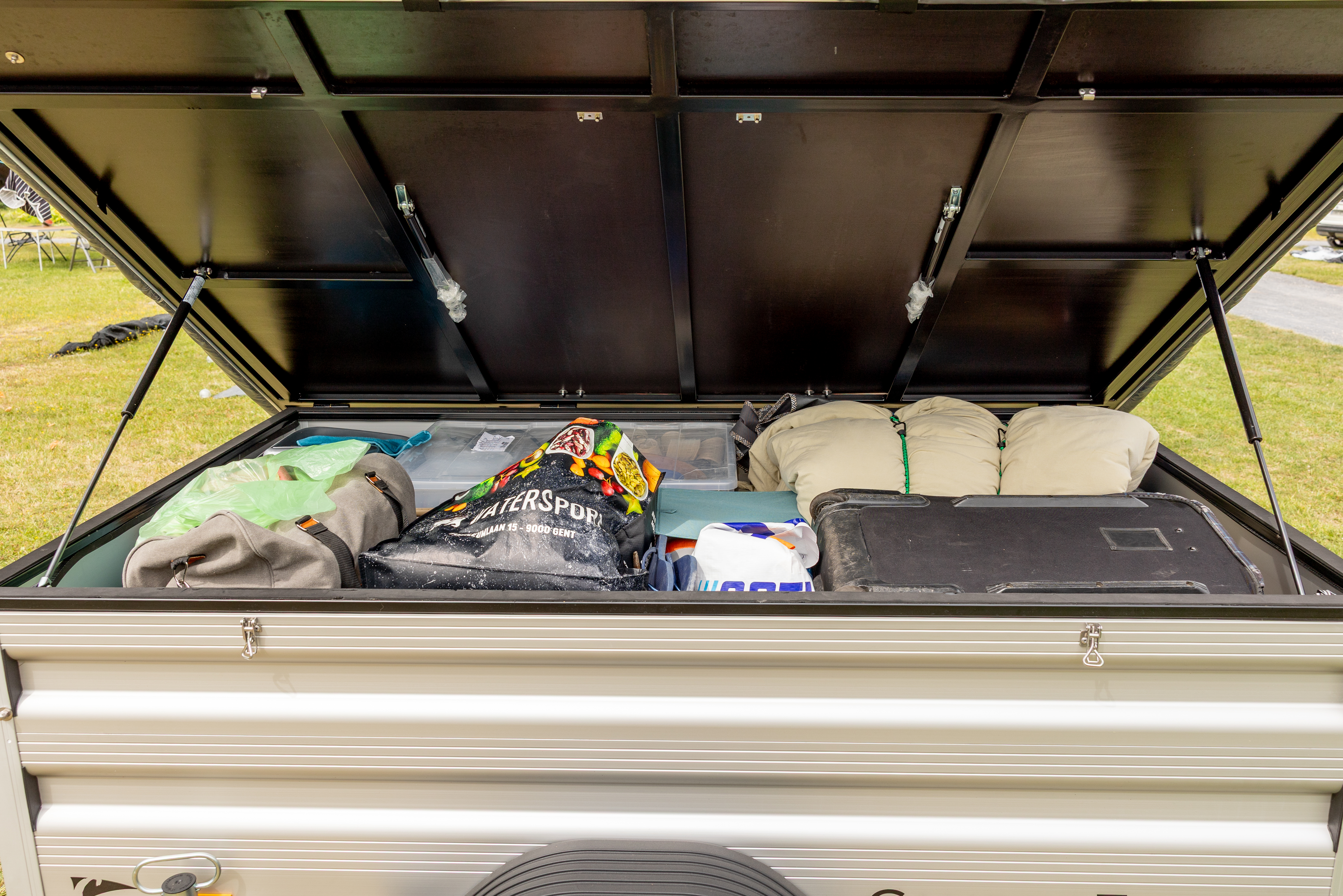 Dat is de vraag die je krijgt zodra je ergens stilstaat, van campingburen, van wandelaars, van toevallige voorbijgangers die het niet kunnen laten even een cirkeltje te lopen rond wat zij oprecht niet lijken te kunnen plaatsen. Een tent, een vouwwagen, een tiny house op vakantie. En dan sta je daar, naast je Campooz Lazy Jack, en besef je dat het eigenlijk allemaal een beetje klopt. Want ja, het is een tent, maar ook een aanhangwagen, met tent erop. In die aanhangwagen zit bakken ruimte. Je kunt er echt een halve kelder in kwijt, zonder dat je het gevoel hebt dat je iets moet laten. Alles verdwijnt vlot naar binnen, en wat niet past, heb je gewoon niet nodig. Slim is ook dat je aan je spullen kan langs voor via een klep in de neus, of van binnenuit via een luik onder het bed. Dat betekent dat je niet hoeft te graven naar een handdoek die je onderin had gelegd, of eerst de halve tent moet ontruimen om aan de wijn te raken.