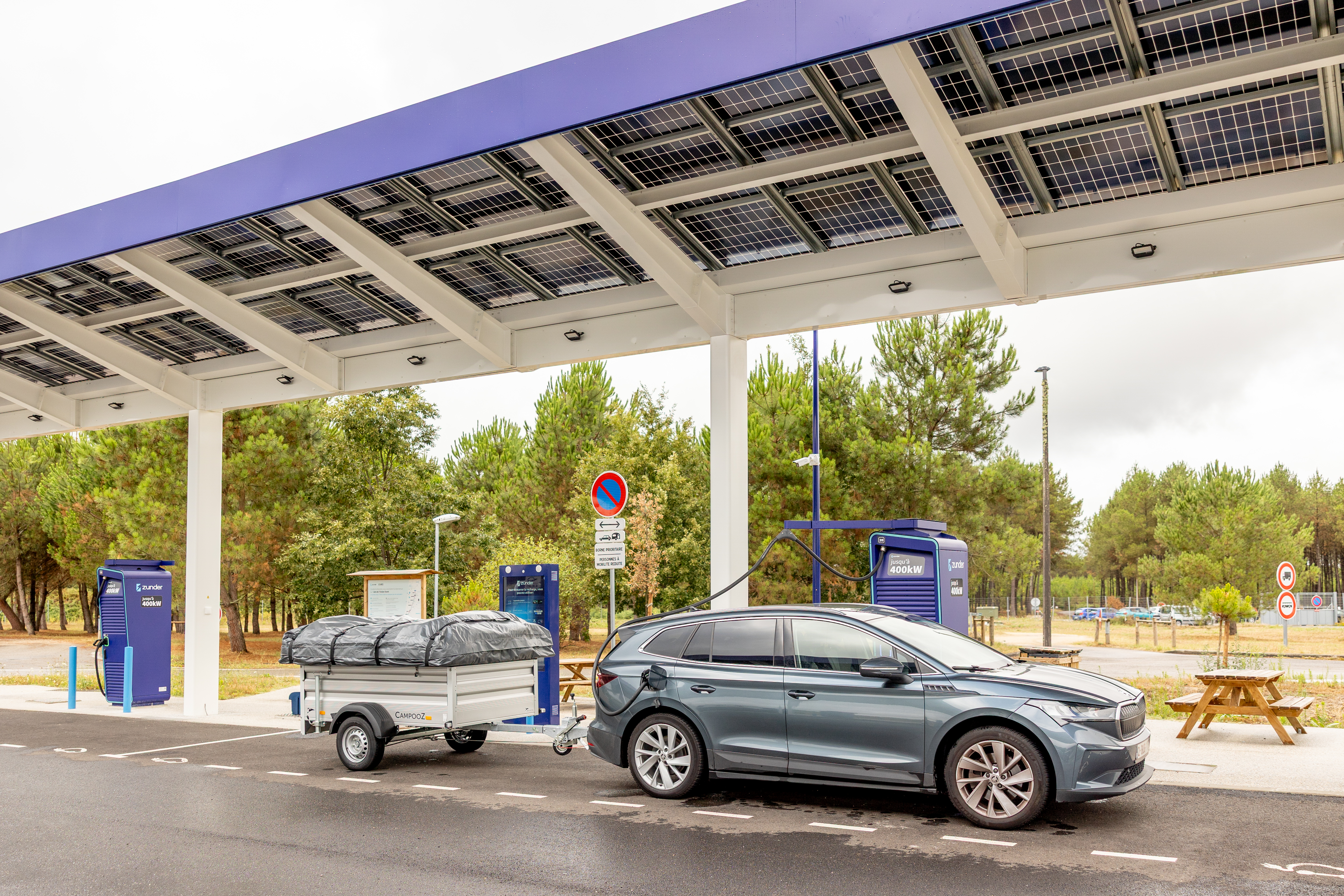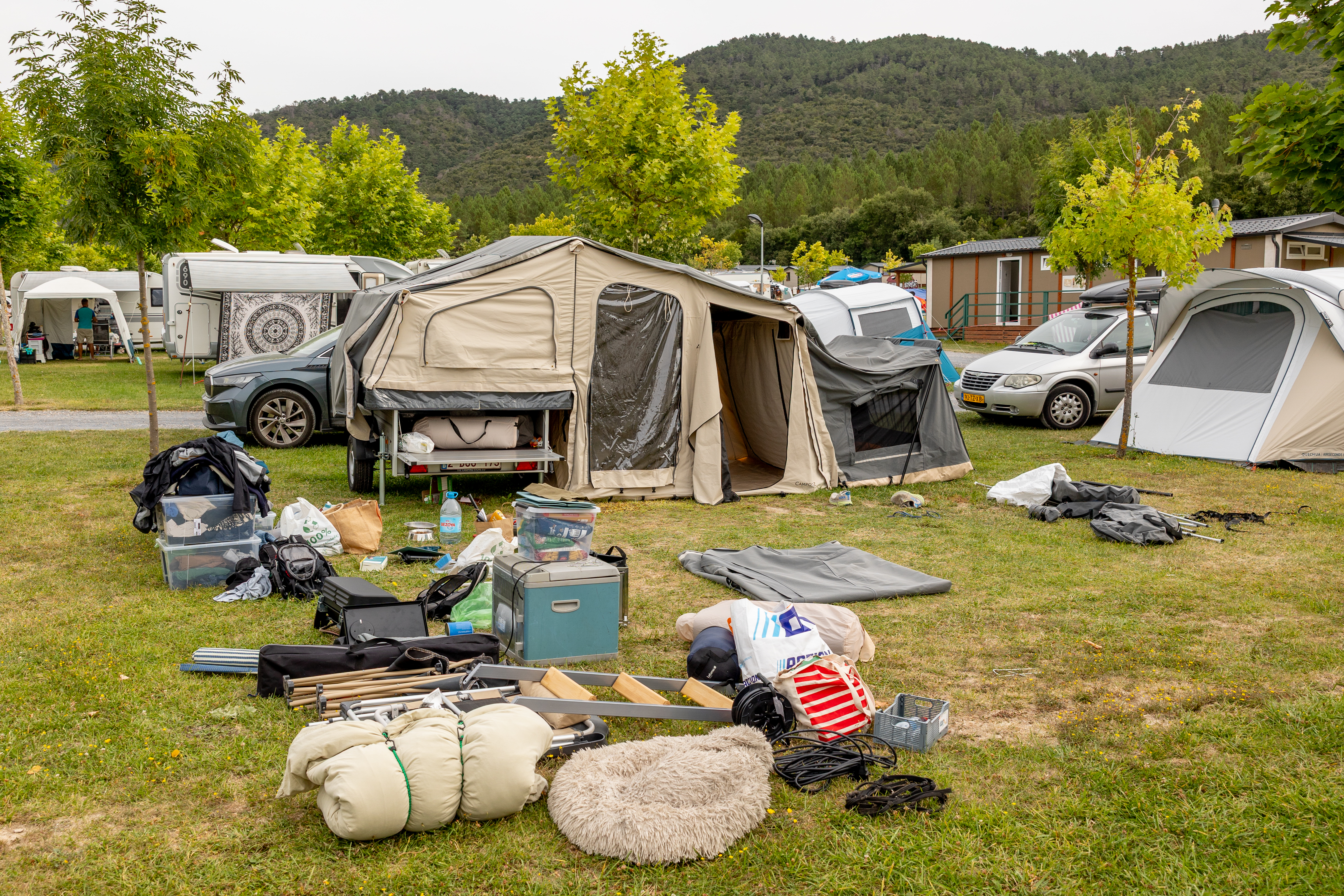 Een paar weken later hing hij eraan, de Campooz Lazy Jack, achter mijn Skoda Enyaq 80 die na drie jaar elektrische dienst nog altijd start zodra je je vinger beweegt. Stevig en comfortabel, al was hij deze keer iets minder ruim, want zowel de wagen als de Campooz zaten tot aan hun virtuele nek volgeladen, kampeergrief, stoelen, kookpotten, sporttassen, teenslippers, een opvouwbare tafel en de persoonlijke spullen van vier volwassenen die beweren licht te reizen, maar elk drie boeken en twee paar wandelschoenen nodig hebben, en dan zwijg ik nog over de essentiële dingen waarvan alleen zij begrijpen waarom ze mee moesten. Ook de hond, een bordercollie met een uitgesproken voorkeur voor beenruimte en overzicht, zat op zijn vaste plek in de koffer. We vertrokken richting diep Spaans Baskenland, met de ambitie om daar de zomer te laten beginnen en onderweg niet volledig door onze batterij of ons geduld gevild te worden. Hoeveel de Campooz geladen weegt, weet ik niet, maar het voelde alsof we onderweg waren naar een humanitaire missie. Toch reed alles vlot. Geen gesleur, geen geslinger, geen gewiebel. Ik reed aan een gezapige negentig per uur en kreeg daar iets onverwachts voor terug, rust. Geen inhaaldrang, geen gejaag, gewoon cruisen. Thuis had ik de wagen tot honderd procent geladen. Het eerste deel van de rit, over vlakke wegen, bracht ons moeiteloos driehonderd kilometer ver. Alles aan in de wagen, airco, muziek, navigatie, en toch bleef het verbruik rond de vijfentwintig kilowattuur per honderd kilometer hangen. Best straf, met een volgeladen wagen, een tenttrailer, vier mensen en een hond die bij het minste oponthoud denkt dat we er zijn. Je voelt ook nauwelijks dat de Campooz eraan hangt, hij volgt als een goed opgevoede hond, zonder nerveus gedoe bij vrachtwagens of in bochten. Natuurlijk weet je, dit blijft niet duren. In de bergen wordt verbruik geen getal meer maar een karaktertest. Je laadt tot tachtig procent en begint te zoeken bij twintig. Dat geeft je een veilige marge van om en bij de tweehonderd kilometer als het meezit op de vlakke, snelle wegen. En als het tegenzit, wind, helling, zenuwachtig blaasgedrag op de achterbank, minder.