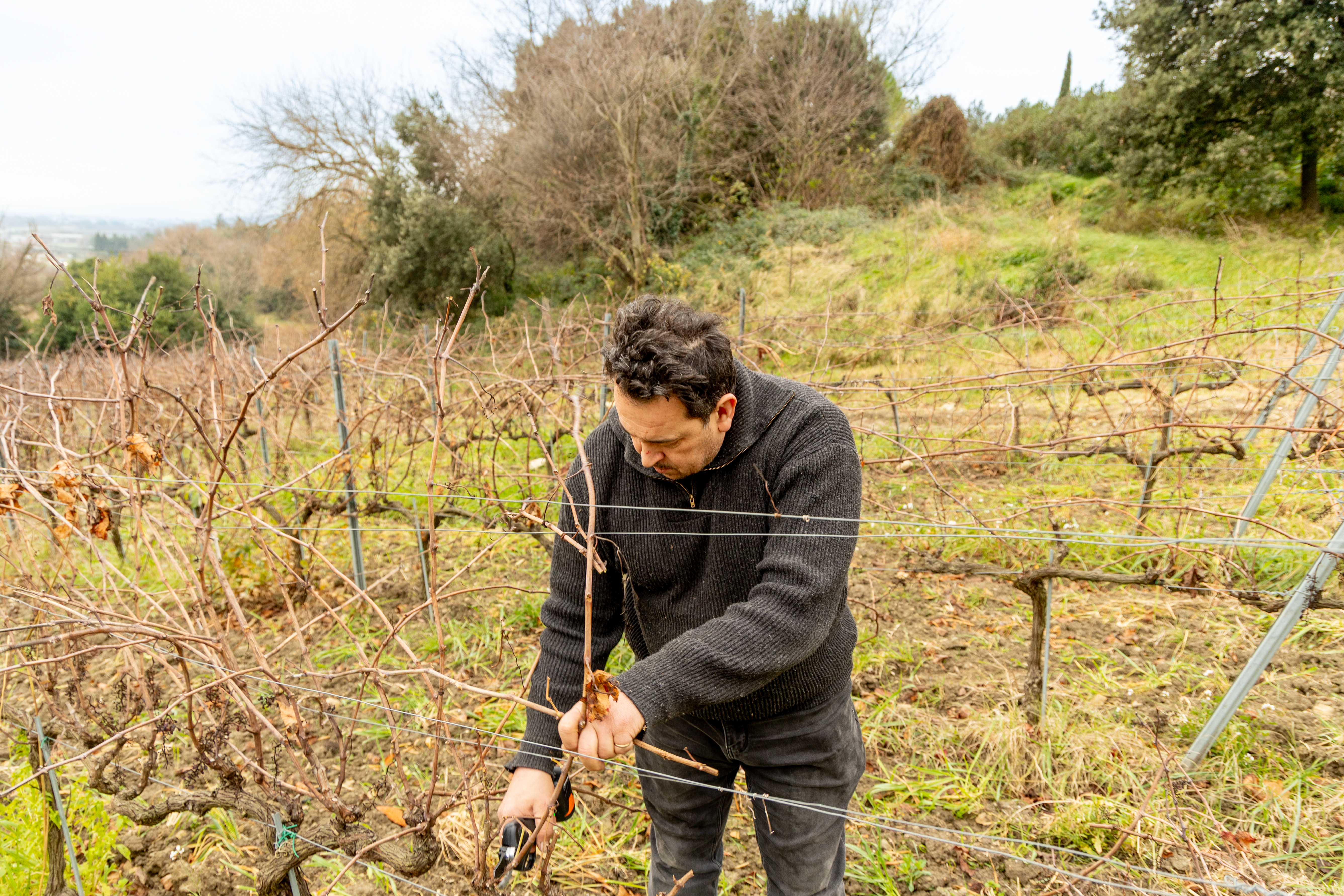 Raphaël Pommier, zo heette de man. Imposant, direct, kort maar vriendelijk. Een boer, dacht ik, maar dan eentje met een denkscherp hoofd. Geen gezever, geen georganiseer. Enkel een blik die zegt: je zit goed. Zijn boerderij lag in het diepste van de Ardèche, net buiten Bourg-Saint-Andéol. Een bastide waarvan je niet weet of ze scheefgezakt is of gewoon karakter heeft. De wijngaarden lagen overal om me heen, in percelen, verspreid over de heuvels, kaal en koppig als een oude hond die weet wat hij waard is. Ik mocht de caravan neerploffen achter de boerderij, tussen de wijnranken die zich tot tegen de muren uitstrekten. Ik was welkom. Dat voelde je meteen. Van hieruit zou ik vertrekken, telkens weer. De kou in, de streek in, en altijd terug naar deze plek die niet probeert te charmeren, en precies daardoor iets onweerstaanbaars heeft.