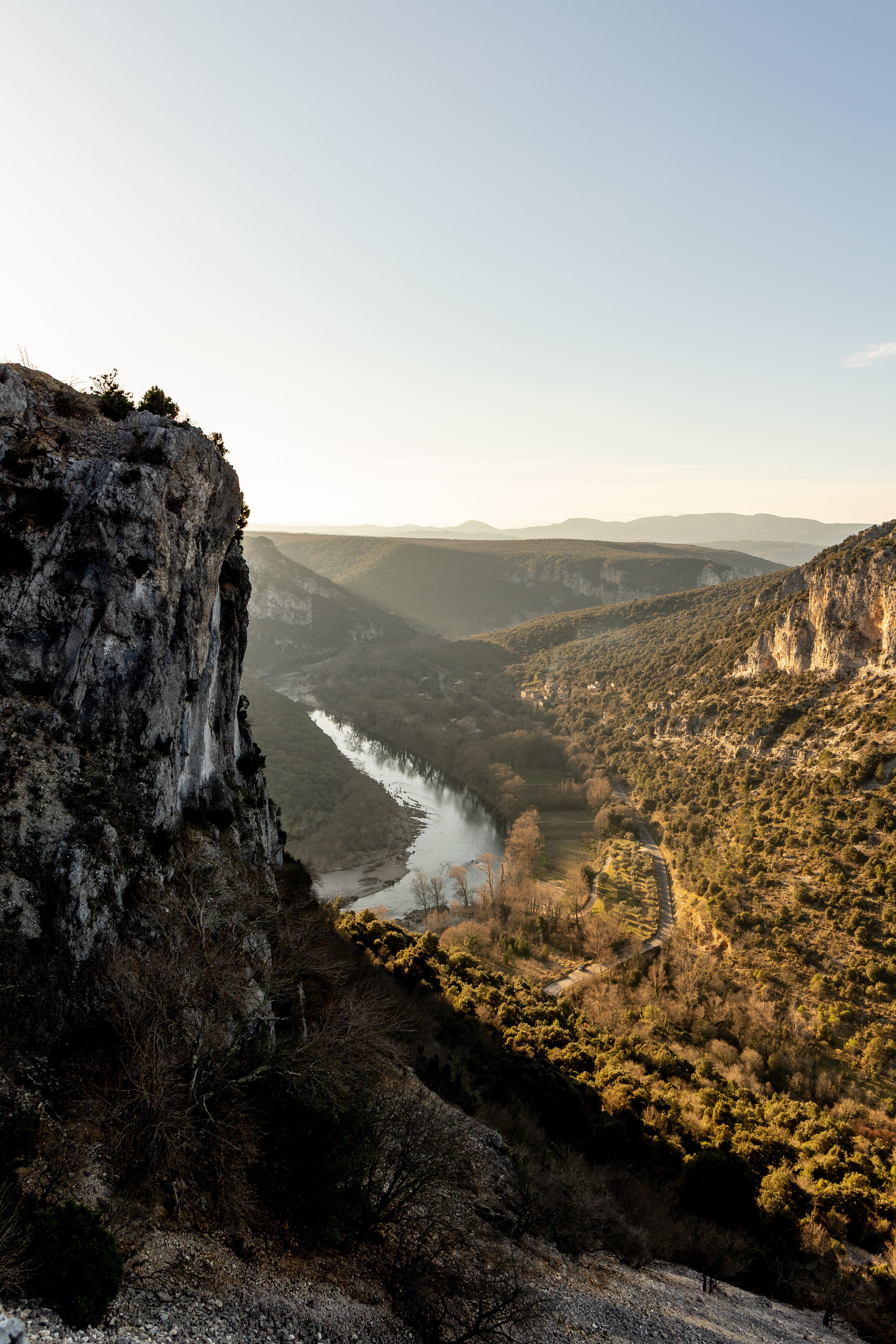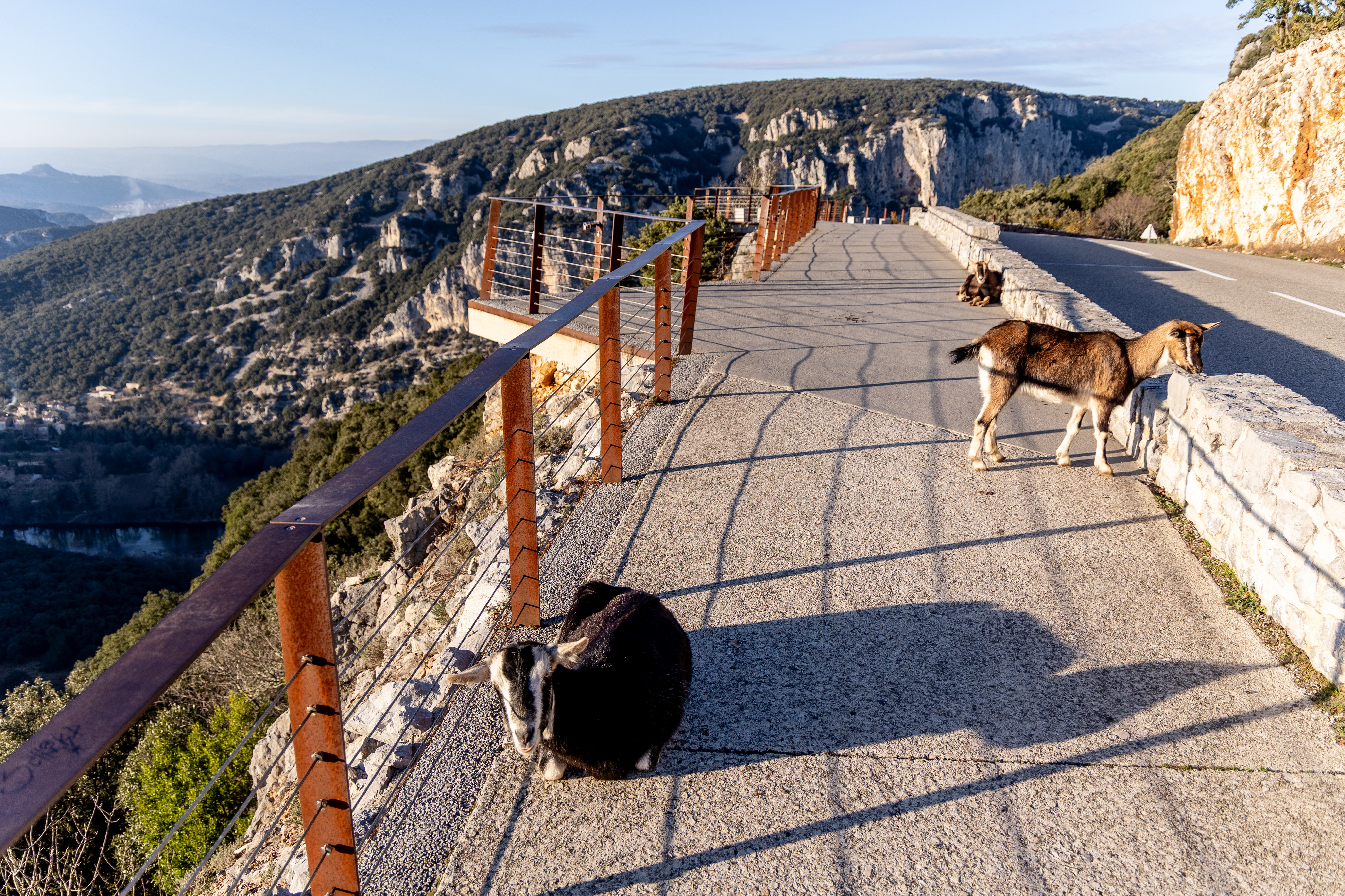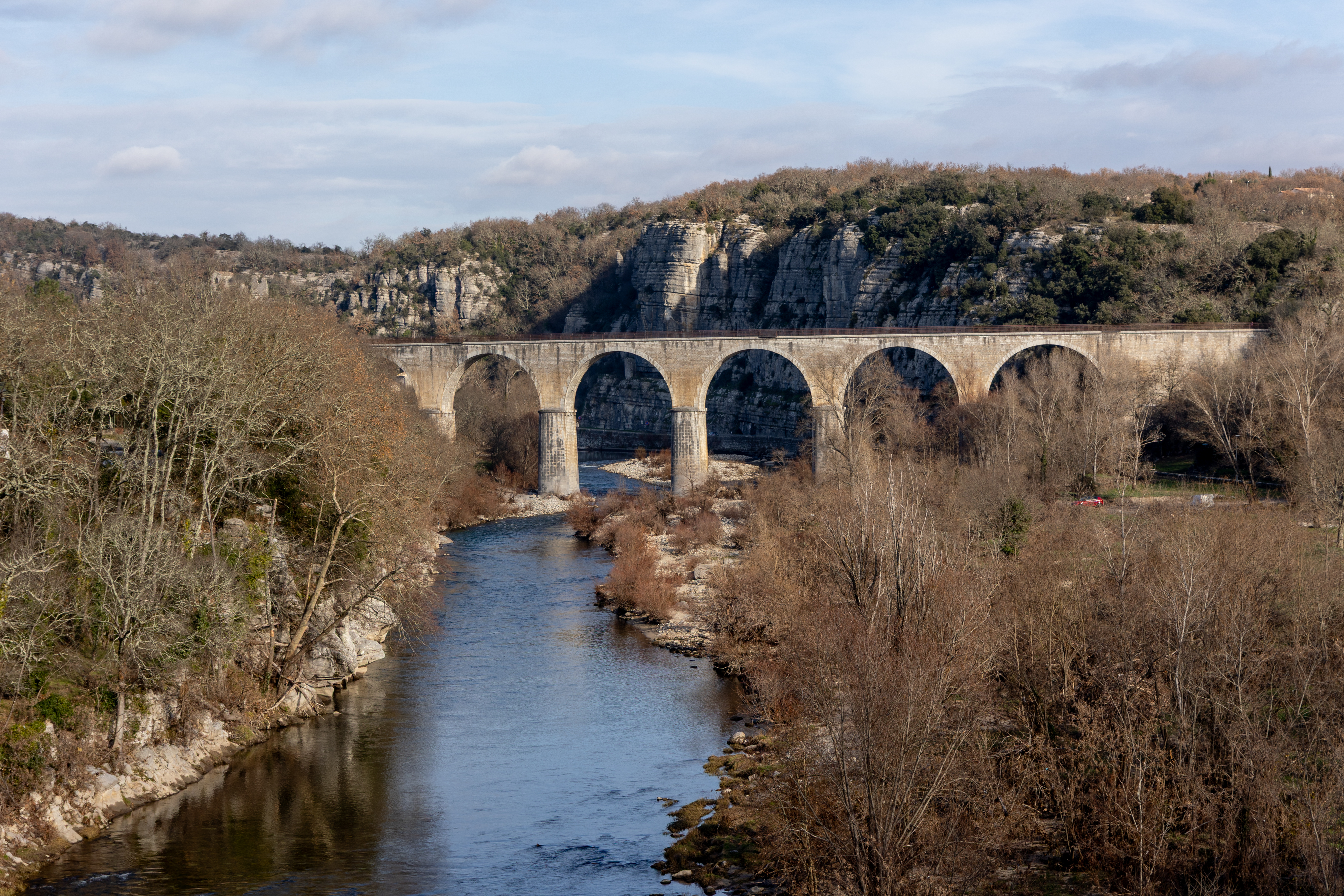 Ik koos lukraak Château d'Alba-la-Romaine als volgende halte. Niet voor het kasteel zelf, al staat het daar als een zelfzekere zwaargewicht, maar voor wat eronder zit. Romeinse resten, netjes opgegraven en met touwen omzoomd. Wat ooit badhuis of opslagplaats was, ligt er nu bij als een vergeten puzzel. Geen spektakel, geen hordes. Alleen wat stenen, wat lucht, en de gedachte dat zelfs tweeduizend jaar geschiedenis op den duur stof wordt. Het museum was gesloten. Niemand liep er rond. Geen reden om open te gaan. Alba zelf straalde bedachtzaamheid uit. Alsof het wist wat eronder lag, maar daar geen drukte over wilde maken. De gevels waren niet mooier dan elders, de pleintjes niet fotogenieker, maar alles klopte net genoeg om er iets van te voelen. Ik wou een koffie drinken, met mijn rug tegen een muur die al een halve eeuw niet meer geverfd was, en kijken hoe de winter zich niet gewonnen gaf, maar zich ook niet verzette. Maar ook dat is in het stille seizoen moeilijk. In die stilte begon iets te bewegen. Niet buiten, maar vanbinnen. De dag was nog jong. De streek ook. En ik had nog tijd. Zonder koffie dan, gewoon verder. Slingerend door kalkland en plukken den, tot het viaduct van Vogüé opdook. Een stenen ribbenkast boven een bijna roerloze Ardèche, de rivier die zijn naam aan deze streek gaf. De ijzeren sporen zijn allang verdwenen, maar de bogen bleven, als herinnering aan een tijd dat zelfs de treinen nog geduld hadden. Vogüé zelf lag aan de overkant, kleverig tegen de wand geplakt als een zwerm zwijgende huizen. De kalksteen reflecteerde het ochtendlicht als een bleke spiegel. Ik parkeerde en bleef even zitten. Soms hoef je niet uit te stappen om te reizen. En toch reed ik verder, want iets trok. Een bocht, een bord, een belofte. Een topper van de zomer, waar bussen grote parkeerplaatsen hebben en kajaks de kinderen doen bulderen. Een bijna toeristisch verzinsel dat zich had vergist in geologie: de Pont d’Arc. Een boog uit steen, uitgesleten door niets dan tijd en water. Hier had de Ardèche zichzelf een poort gegeven. Geen ingang, geen uitgang, enkel doorgang. Ik stapte uit, liep naar het uitkijkpunt en zweeg. Het was december. Drie maanden na de massa. Volle stille winter. Magisch. Maar in mijn hoofd klonk het opnieuw, dat vrolijke lentelied. Alsof de kat alweer krols werd, midden in de winter. En dat, enkel door de schoonheid van deze buurt. Ik volgde de D290, de route touristique des Gorges de l’Ardèche, een weg die zich, soms schurend tegen de afgrond, een pad baant langs de rand van de kloof. Bocht na bocht, zon op het stuur, stilte achter elke draai. Aan het belvédère du Serre de Tourre lagen geiten op het warme asfalt, alsof ze hier al eeuwen de wacht hielden. Een motorrijder hield halt, trok zijn helm af en zijn smartphone boven. De geit poseerde. Ik moest lachen. Alles klopte. Ik stapte uit. Beneden gleed de Ardèche als een traag zilveren lint door het gesteente. De lucht stond stil, alleen het landschap bewoog, langzaam, in licht. Hier hoefde je niets meer te zoeken, enkel blijven staan. Er zat geen enkele logica in het pad dat ik volgde, maar dat is net het mooie. Volgen waar je zin in hebt, waar je blik op blijft hangen, wat je opgevangen hebt, wat je zogezegd moet gezien hebben.
