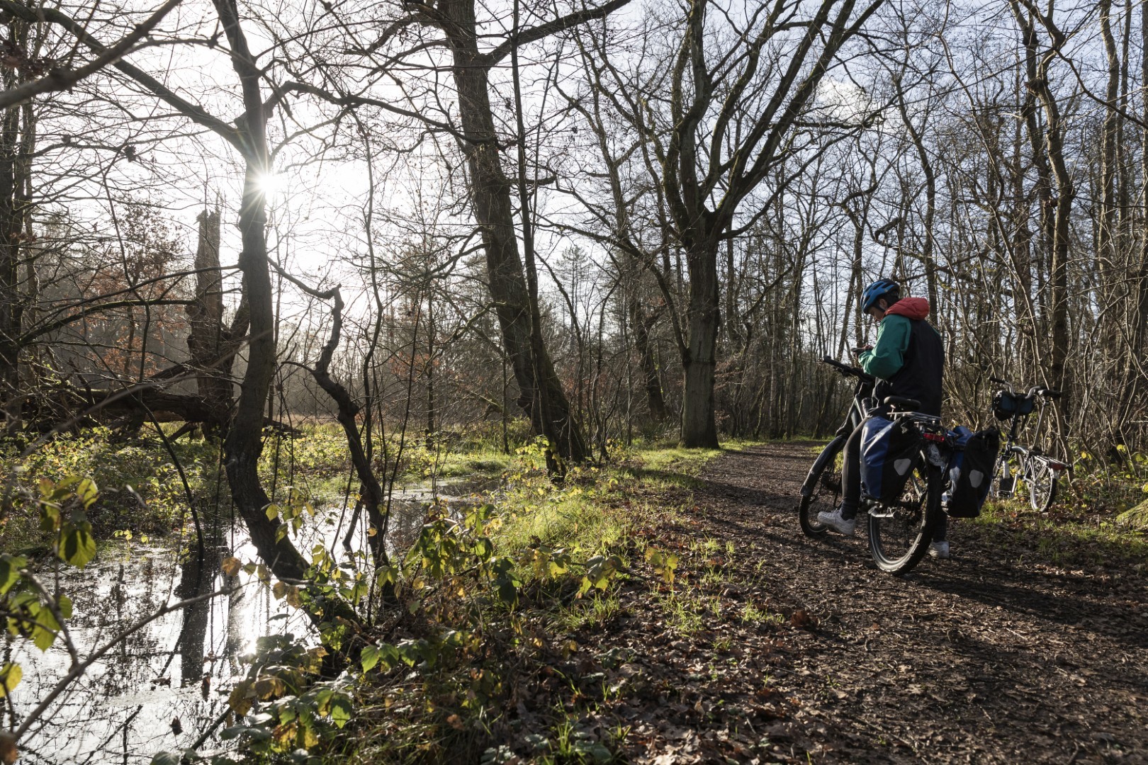 De volgende uren zijn puur genot. De afstand die we overbruggen is haast verwaarloosbaar - een schamele tien kilometer - maar we stoppen zowat elk kwartier om rond te kijken, foto’s te nemen of kort een klein wandelweggetje in te slaan. Het begint in Cassenbroek, waar we spontaan willen beginnen rijmen over verdronken bomen. Duizend jaar geleden stroomde hier de Demer, die nu veel vroeger - al in Werchter - samenvloeit met de Dijle. De meander van de Demer verdween, het water bleef, waarna een dikke veenlaag zich vormde. Het natte landschap zet zich verder in Mispeldonk, nog een natuurgebied waar open weidelandschappen, vochtige loofbosjes en zelfs heide elkaar afwisselen. Met onze fietsen kunnen we niet diep in het gebied, maar zelfs langsrijden is een plezier. Cassenbroek en Mispeldonk vormen samen met Mechels Broek één groot, groen netwerk in de Beneden-Dijlevallei. Een lappendeken van kronkelende sloten, modderige paden en zompige grasvelden die herinneren aan een verleden vol water, toen hier het natuurlijke overstromingsgebied van de Dijle was. De zon zakt stilletjes neer terwijl we over het mooiste weggetje rond Mechelen - de Muizenhoekstraat - terug richting Muizen fietsen. We zijn omringd door knotwilgen, die al eeuwenlang nergens beter thuishoren dan hier. Rechts van ons strekt het Mechels Broek zich uit, met haar vijvers en vogelijkhutten. In Het Brughuis warmen we op boven een dampend bord spaghetti. Stamgasten waaien binnen, buiten valt de avond, terwijl onze wangen gloeien van de brandende stoof. De lus is rond - en wij moe maar tevreden.