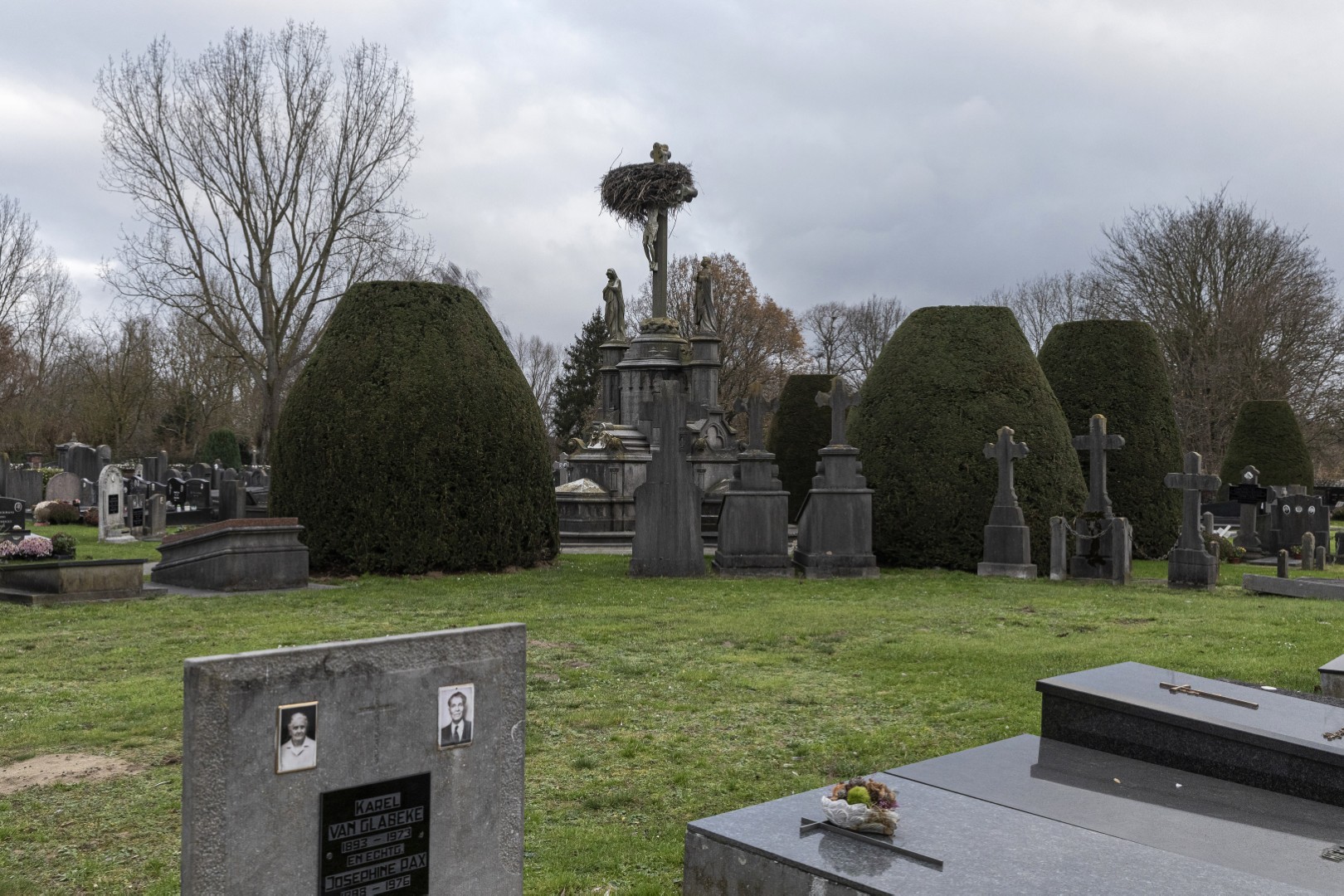 We zijn een tikje teleurgesteld. Ze zitten er niet. Vanuit het station van Mechelen zijn we de slingerende Dijle gevolgd tot aan het kerkhof van Muizen. Hier staan wel vaker fietsers en wandelaars stil. Niet zozeer voor de zee van grijze grafzerken, wél voor het koppel ooievaars dat een nest gebouwd heeft op een levensgroot kruisbeeld van Jezus. Een indrukwekkend nest. Het hoofd en de armen van Jezus verdwijnen volledig onder een gigantisch bouwwerk van takken en twijgen. Sommigen zien er een reusachtige doornenkroon in, of een symbolische ontmoeting van leven en dood. We stappen van onze fiets en lopen de begraafplaats op. Ooievaars trekken normaal naar het zuiden om te overwinteren, maar het echtpaar uit Muizen besloot deze winter voor het eerst om hier te blijven. De kans dat we ze in hun nest zouden zien zitten, was er dus, maar helaas… Ze zullen slakken of wormen aan het zoeken zijn in de Barebeekvallei. De ooievaars zijn geliefd bij buurtbewoners en voorbijgangers, maar niet geheel onbesproken. Hun nest weegt gemakkelijk een paar honderd kilogram, wat zelfs voor een man als Jezus lastig is om te dragen. Talloze pogingen zijn er al ondernomen om de ooievaars weg te lokken naar een andere, nieuwe nestpaal in de buurt. Er werd plastic en ijzerdraad rond het hoofd en de armen van het Jezusbeeld gedraaid om het koppel te ontmoedigen hun nest hier te bouwen. De ooievaars staan erbij en kijken ernaar. En blijven lekker zitten.*