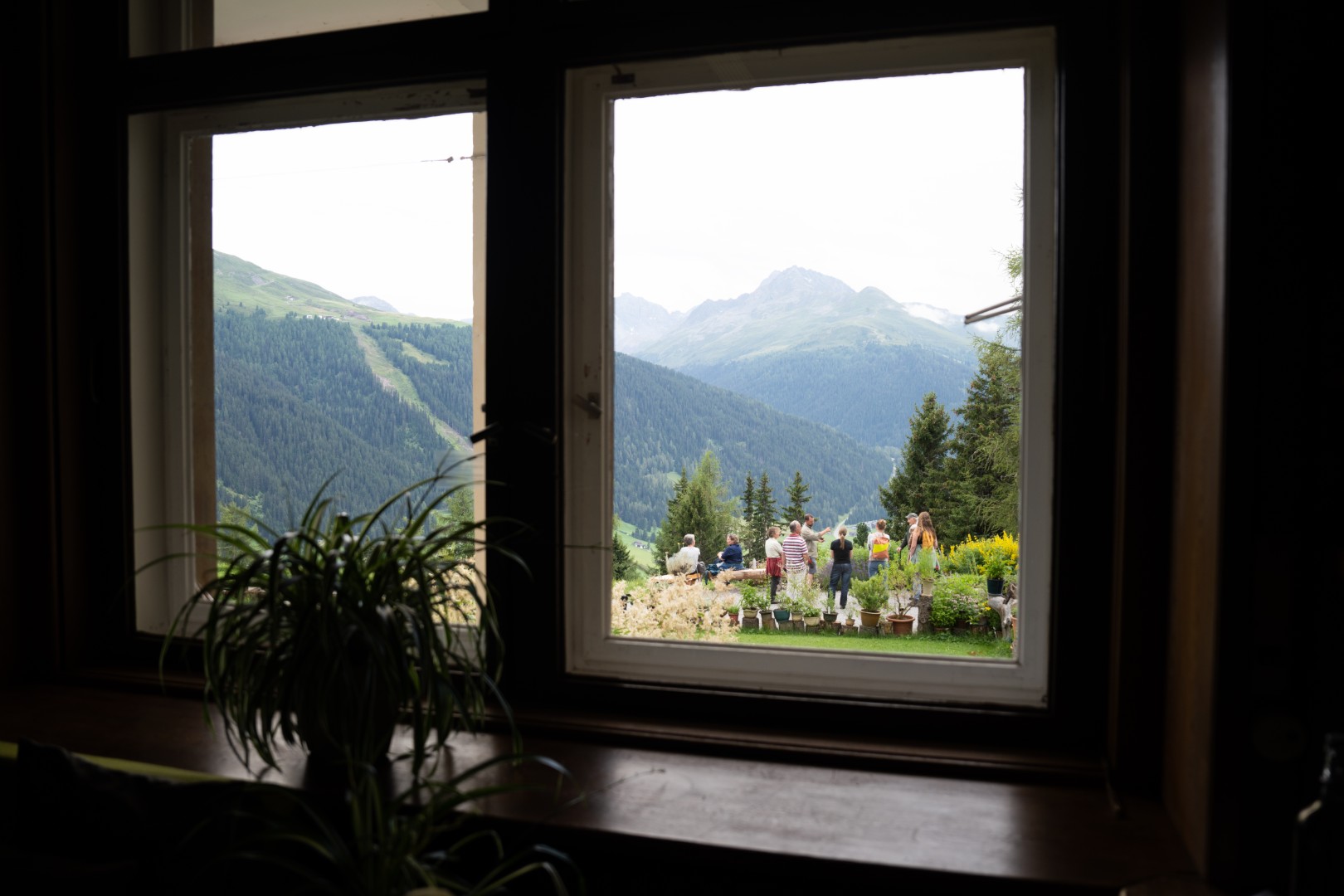 Houten wanden met deuren scheiden mijn balkon van dat van de buren. Artsen bezochten hun patiënten in de buitenlucht en kwamen binnen zonder kloppen. Ik week mezelf los van mijn ligstoel, haal net op tijd de tandradbaan en neem in Davos-Platz de bus naar het bergdorp Monstein. Een schattig kerkje, houten huizen en kratten bier van de lokale microbrouwerij die koelen in de dorpsfontein: hoe paradijselijk! Ik bestel een middagmaal op het terras van Hotel Ducan. ‘In De Toverberg komen de personages op excursie naar ons hotel’, vertelt Benjamin Schibli. ‘De twee filosofen voeren hier een heftige discussie.’ Wel leuk, zeg ik, dat je zaak voorkomt in een wereldberoemde roman. ‘Ik wist het niet’, grinnikt hij. ‘Een Duitse journalist heeft me de scène gisteren voorgelezen.’