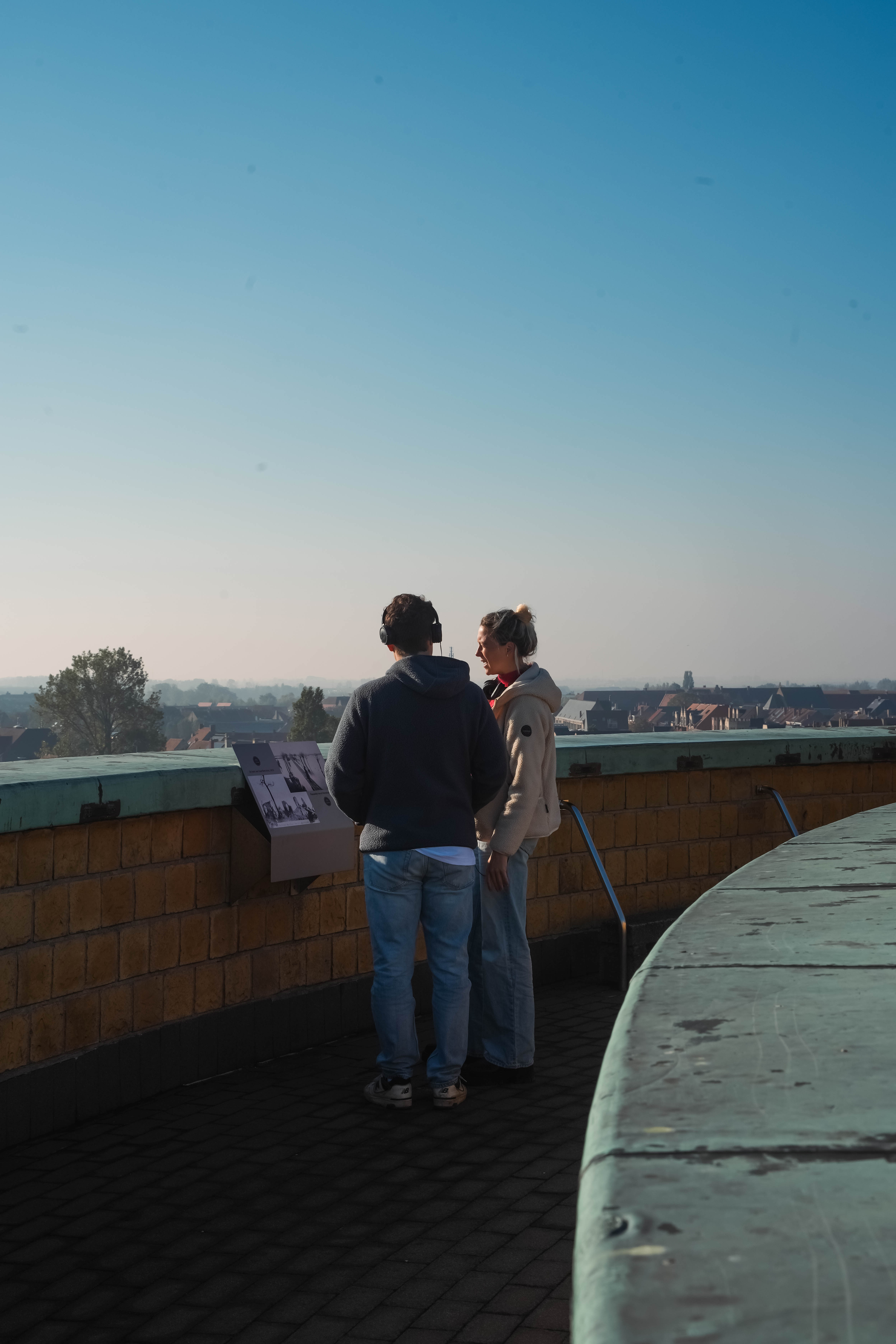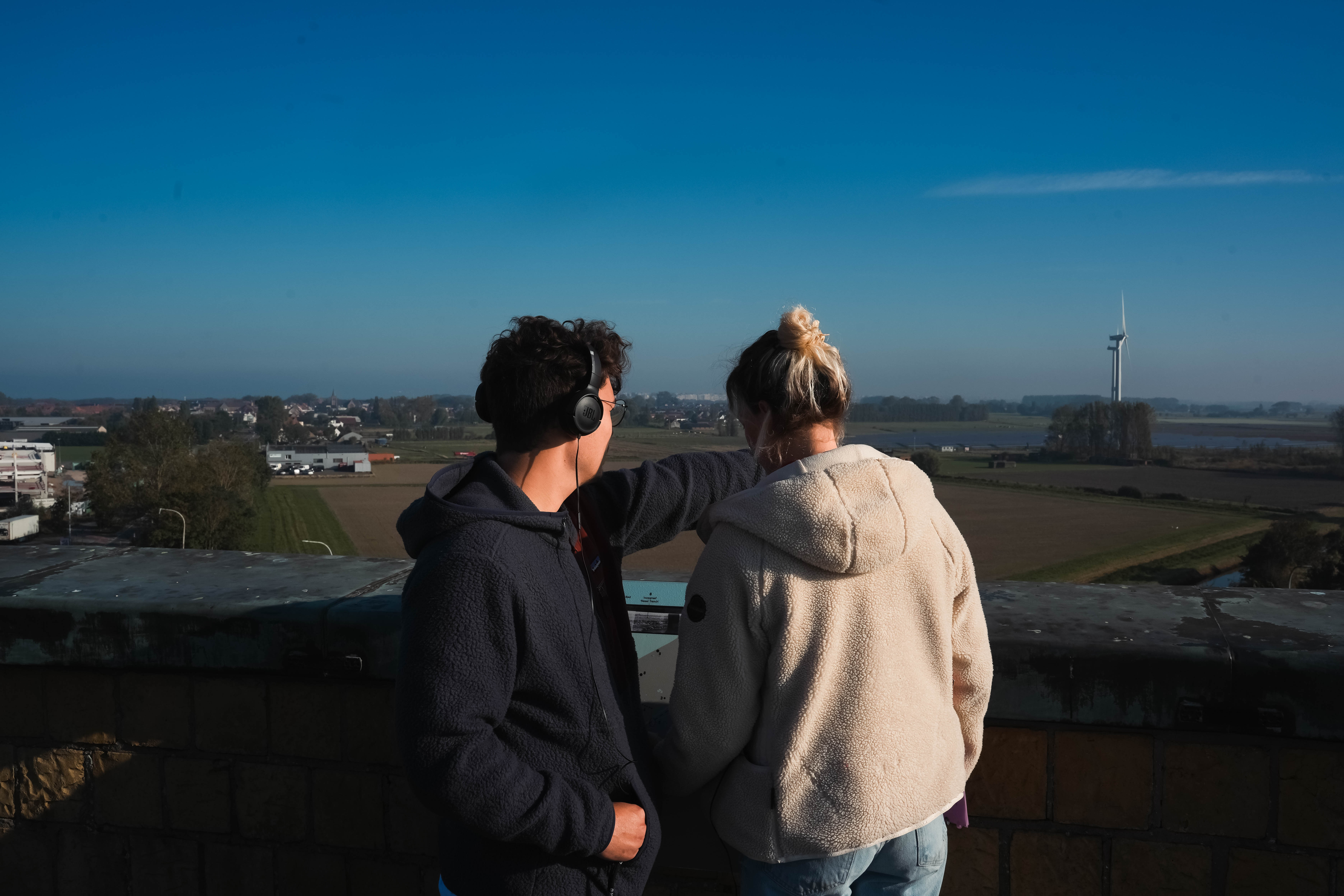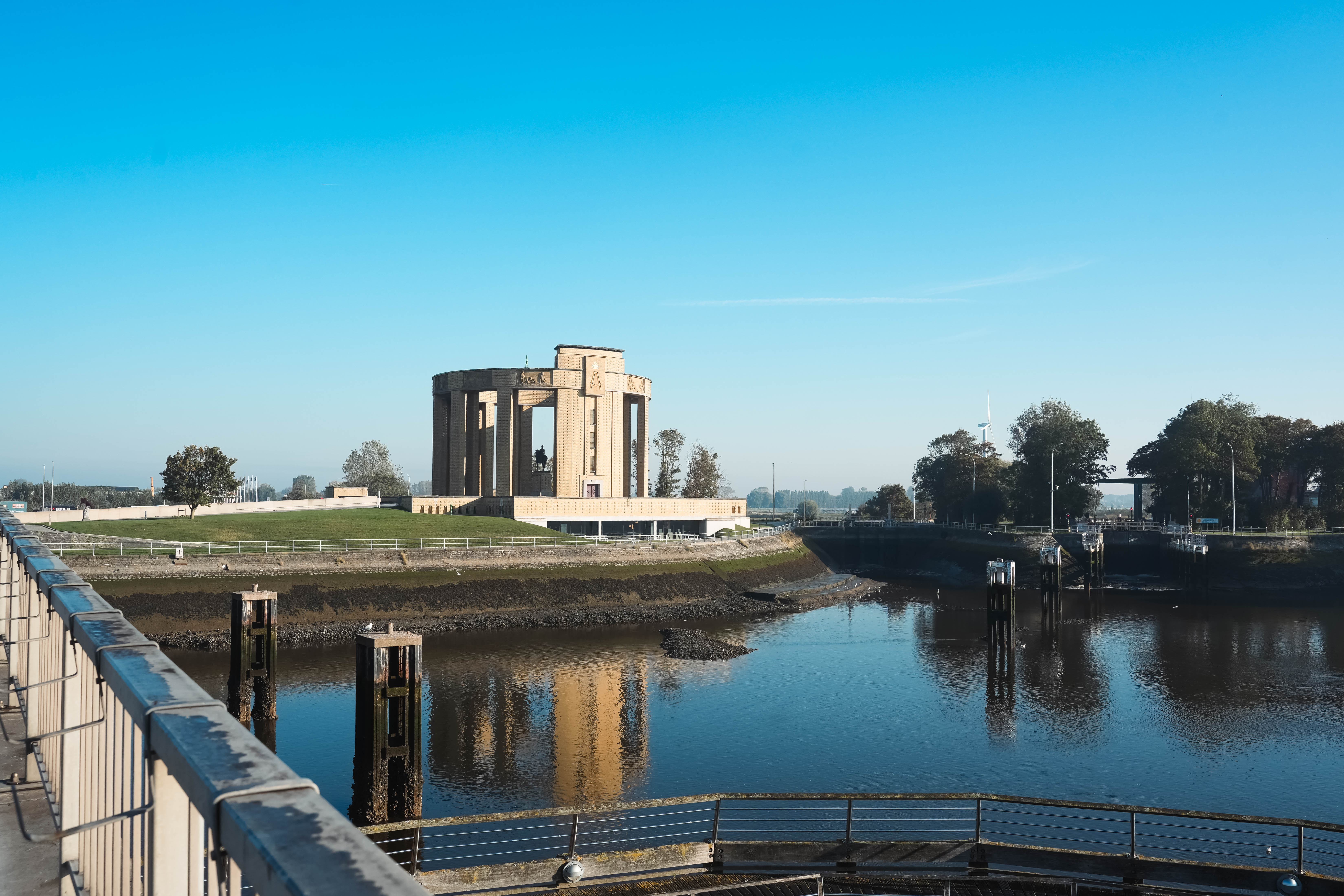 Ondanks de oktoberzon dalen de nachtelijke temperaturen onder nul. Wat we later op de dag leren over de ontberingen van de frontsoldaten op deze plek, helpt om de beroerde nacht te relativeren. Op nog geen tien minuten wandelen van Kompas Camping treffen we de Ganzepoot aan, het sluizencomplex waarmee de onderwaterzetting van de IJzervlakte werd aangestuurd. Het indrukwekkende Westfront, een oorlogsmonument ter ere van Koning Albert I dat tijdens de jaren dertig werd opgetrokken, schittert goud in de ochtendzon. Tijdens de honderdjarige herdenking van de Groote Oorlog werd er onder dit monument een bezoekerscentrum opgericht. Dat werd in 2024 volledig vernieuwd. Met behulp van een podcastwaardige audiogids herbeleven we de oorlogservaring van drie fictieve historische personages. Een korte zelftest helpt ons om een keuze te maken tussen het verhaal van Ellie, een verpleegster uit Brussel, Juul, een kunstenaar-frontsoldaat, en Rosa, een kind uit Nieuwpoort dat de tentoonstelling op kindermaat brengt. Hoewel de personages in enigszins genderstereotiepe rollen worden gepresenteerd, biedt de verscheidenheid aan perspectieven wel een verrijkende blik op de impact van de oorlog.
