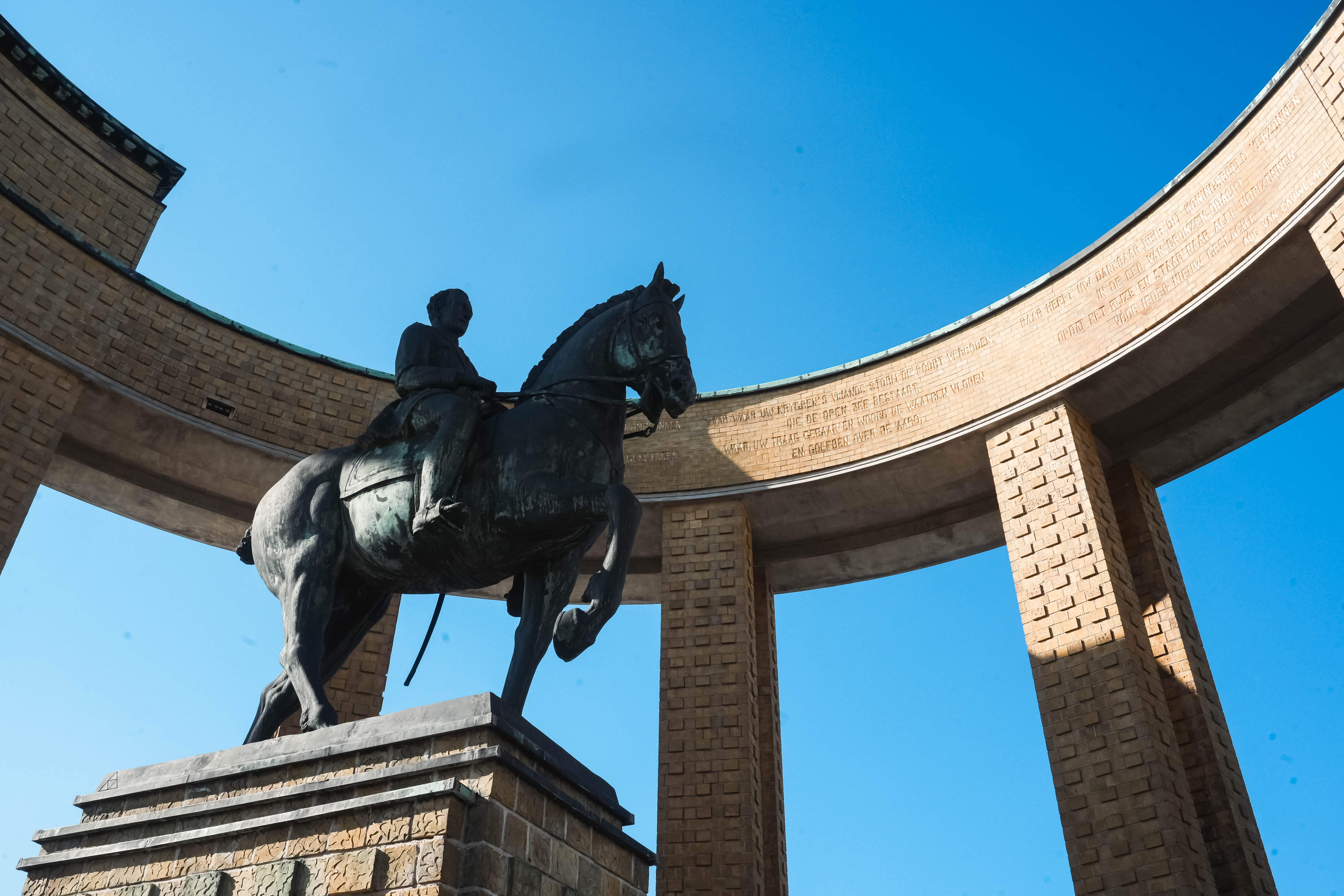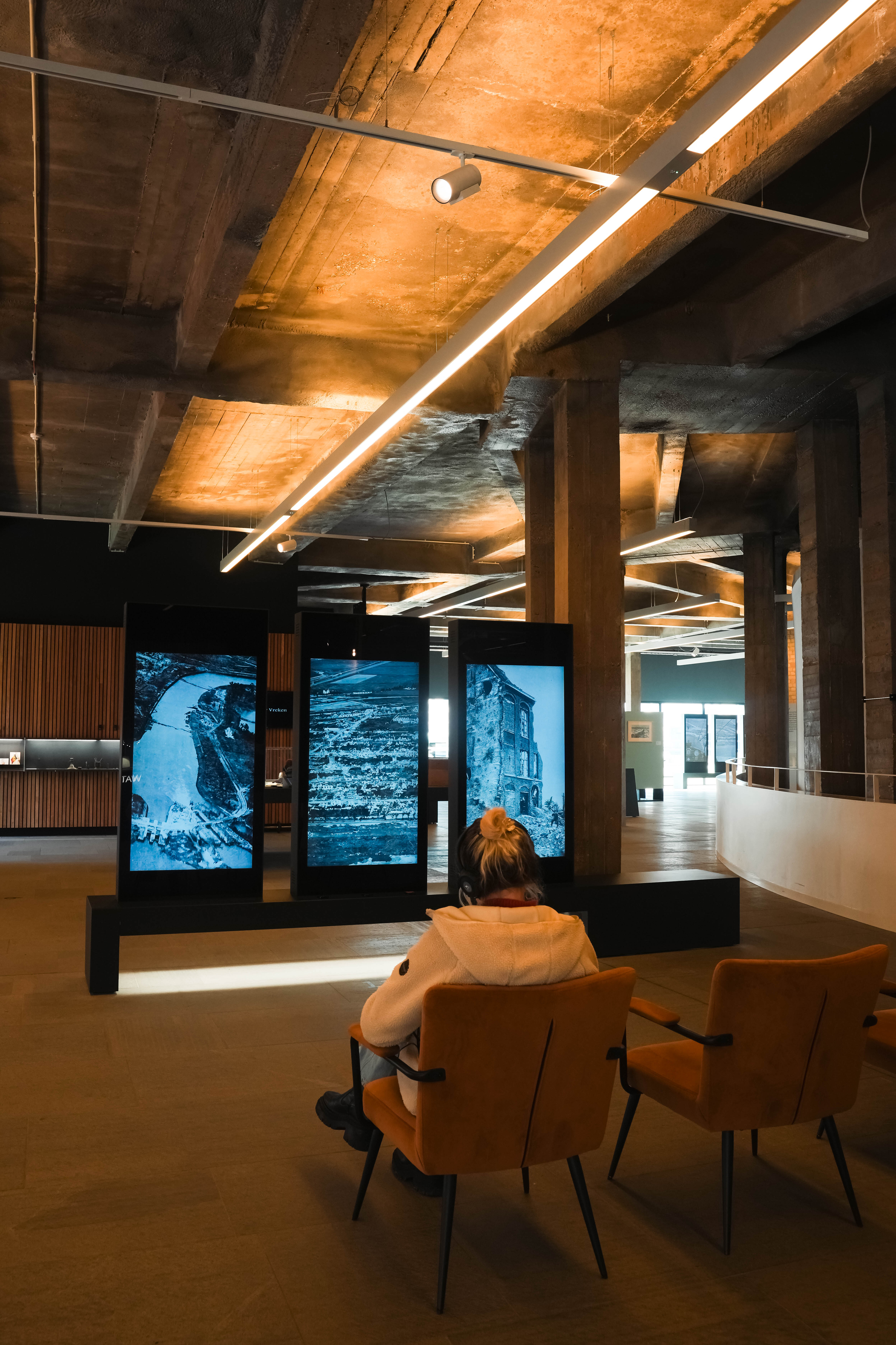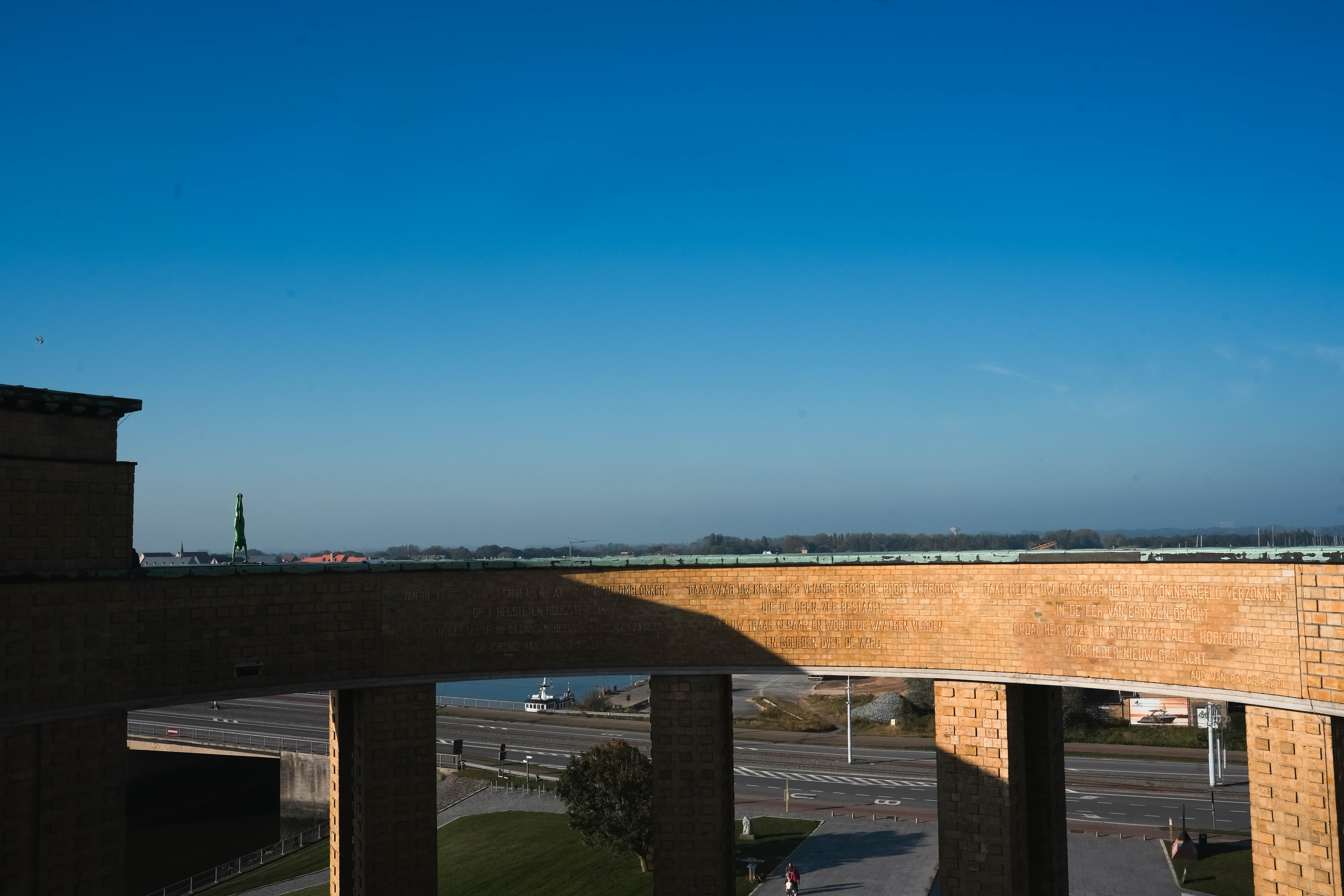 Ondanks de oktoberzon dalen de nachtelijke temperaturen onder nul. Wat we later op de dag leren over de ontberingen van de frontsoldaten op deze plek, helpt om de beroerde nacht te relativeren. Op nog geen tien minuten wandelen van Kompas Camping treffen we de Ganzepoot aan, het sluizencomplex waarmee de onderwaterzetting van de IJzervlakte werd aangestuurd. Het indrukwekkende Westfront, een oorlogsmonument ter ere van Koning Albert I dat tijdens de jaren dertig werd opgetrokken, schittert goud in de ochtendzon. Tijdens de honderdjarige herdenking van de Groote Oorlog werd er onder dit monument een bezoekerscentrum opgericht. Dat werd in 2024 volledig vernieuwd. Met behulp van een podcastwaardige audiogids herbeleven we de oorlogservaring van drie fictieve historische personages. Een korte zelftest helpt ons om een keuze te maken tussen het verhaal van Ellie, een verpleegster uit Brussel, Juul, een kunstenaar-frontsoldaat, en Rosa, een kind uit Nieuwpoort dat de tentoonstelling op kindermaat brengt. Hoewel de personages in enigszins genderstereotiepe rollen worden gepresenteerd, biedt de verscheidenheid aan perspectieven wel een verrijkende blik op de impact van de oorlog.