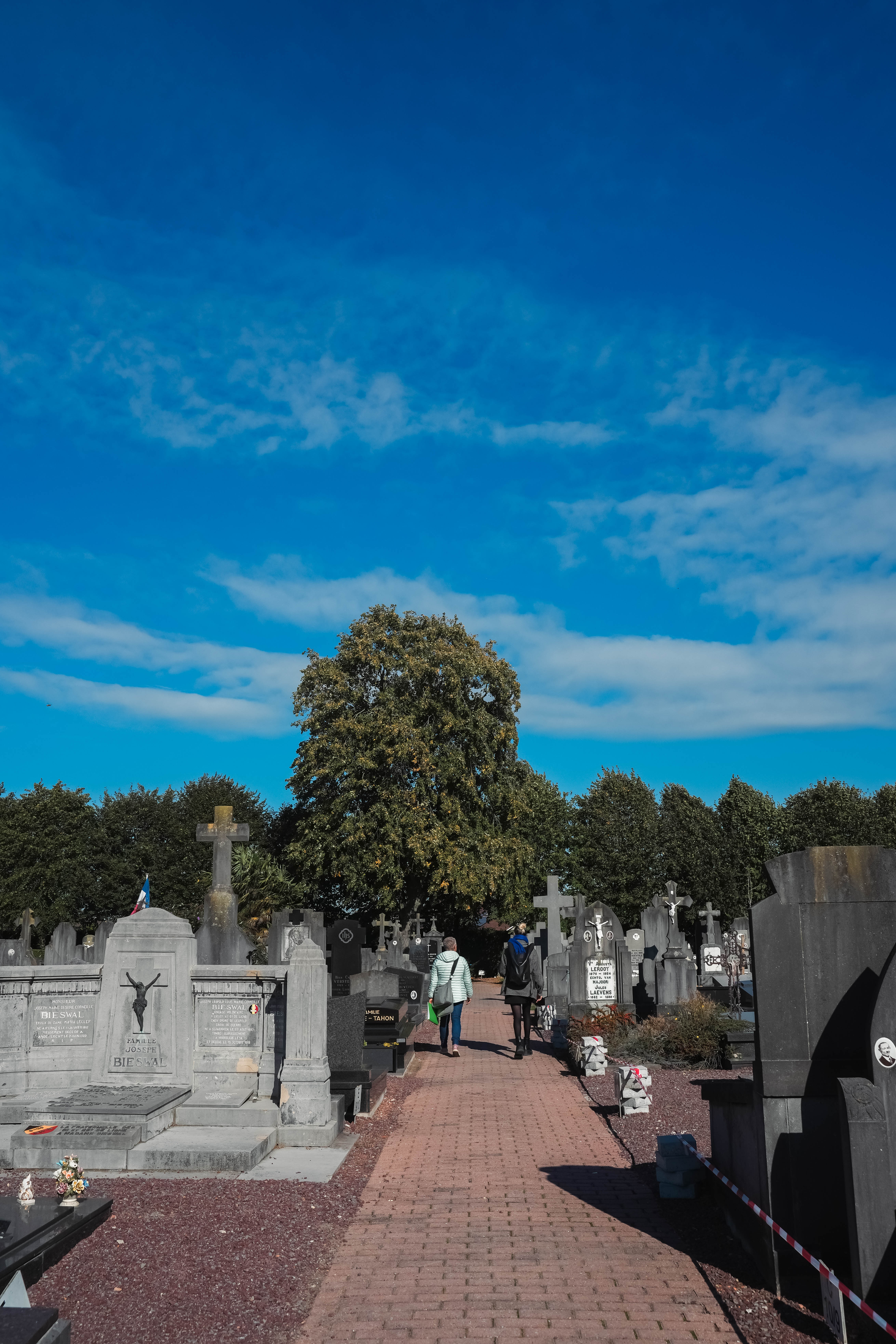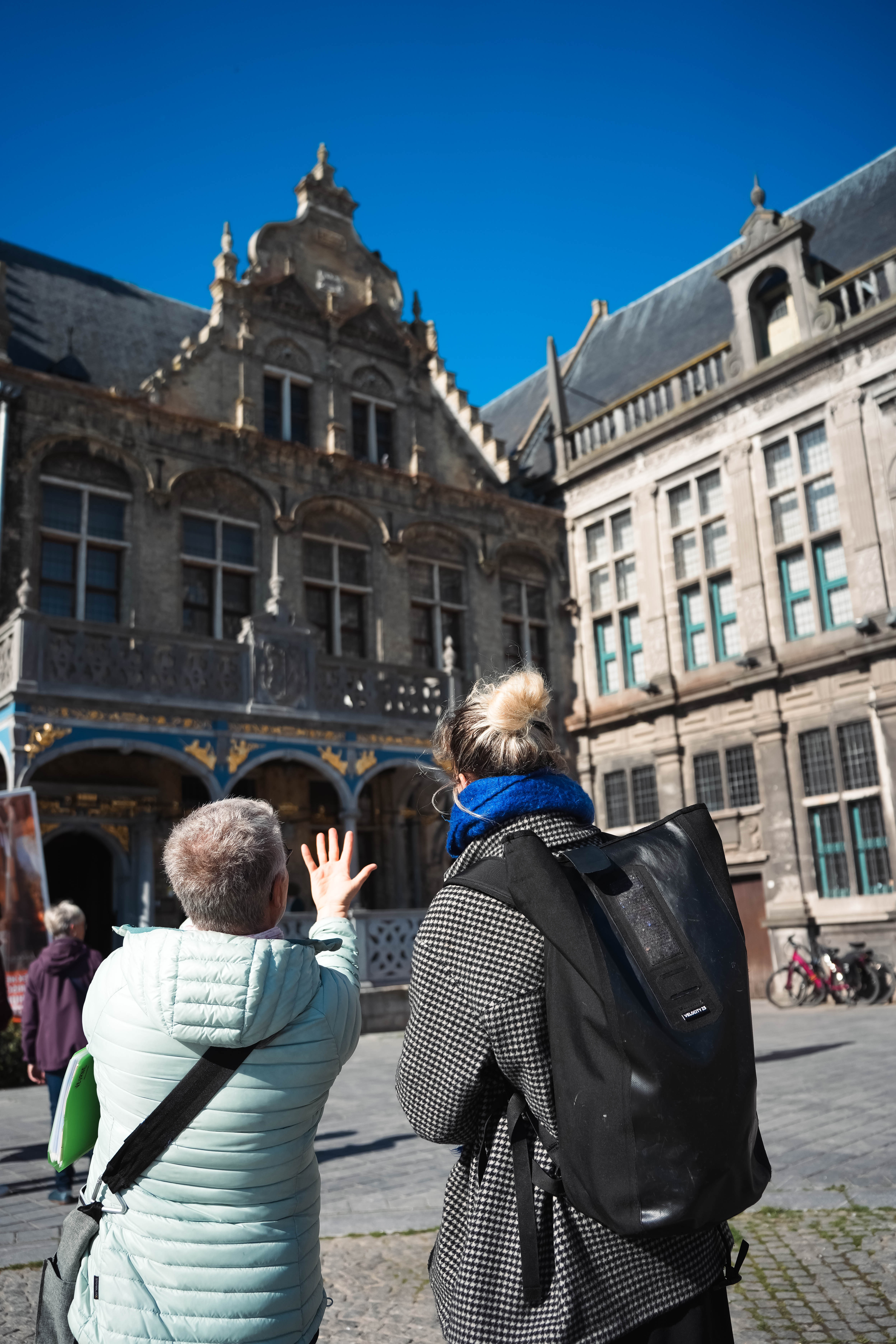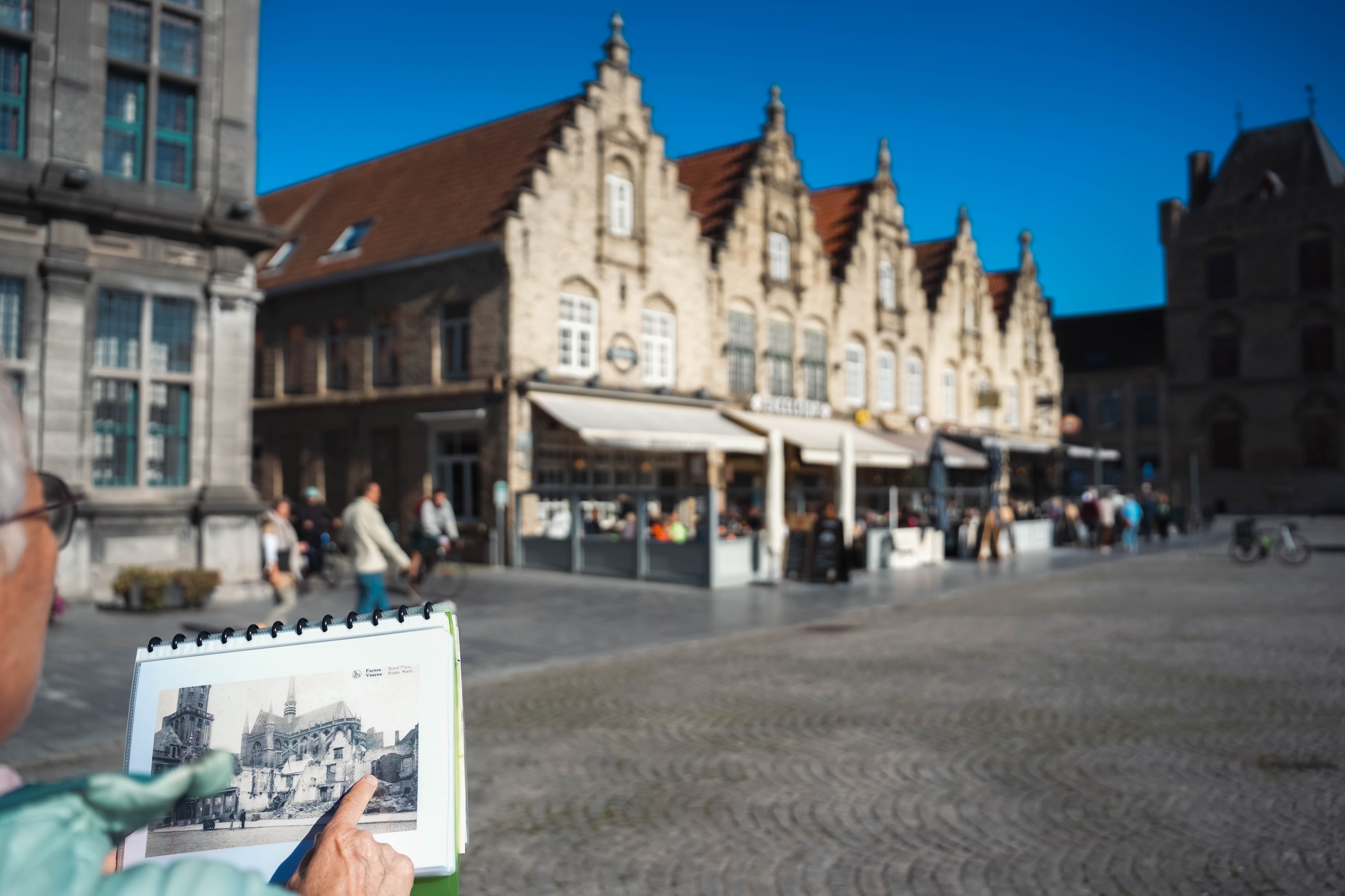 Omdat Veurne niet mag ontbreken in een toer door het oorlogsverleden van de Westhoek, sluiten we ons weekend af met een gegidste stadswandeling. Gewapend met een map vol oude foto’s en schilderijen laat onze gids Greet onderweg het verleden tot leven komen. We startten op de Grote Markt, die in de zeventiende eeuw uit economische noodzaak werd aangelegd onder Albrecht en Isabella – en vandaag nog steeds wordt omzoomd door gebouwen in renaissancestijl. Eén daarvan is het Stad- en Landshuis, dat tijdens WOI dienstdeed als hoofdkwartier van Albert I. Ondanks de nabijheid van het front bleef Veurne grotendeels gespaard van bombardementen, waardoor we langs veel materiële ijkpunten van haar geschiedenis kunnen wandelen. In het Stadspark stuiten we op een restant van een negende-eeuwse mote, waar de eerste bewoners zich vestigden. We passeren onder meer langs de dertiende-eeuwse Sint-Walburgakerk, het Muzekot, het oudste woonhuis van Veurne uit 1570, en achttiende-eeuwse burgerhuizen in de Zwarte Nonnenstraat die gebouwd werden ten tijde van het Oostenrijkse bewind. Onderweg komen we kleine beeldjes van ‘Veurnse slapers’ tegen – een bijnaam die de Veurnaars kregen toen de lakenhandel tussen Engeland en Veurne stil kwam te liggen in 1270.