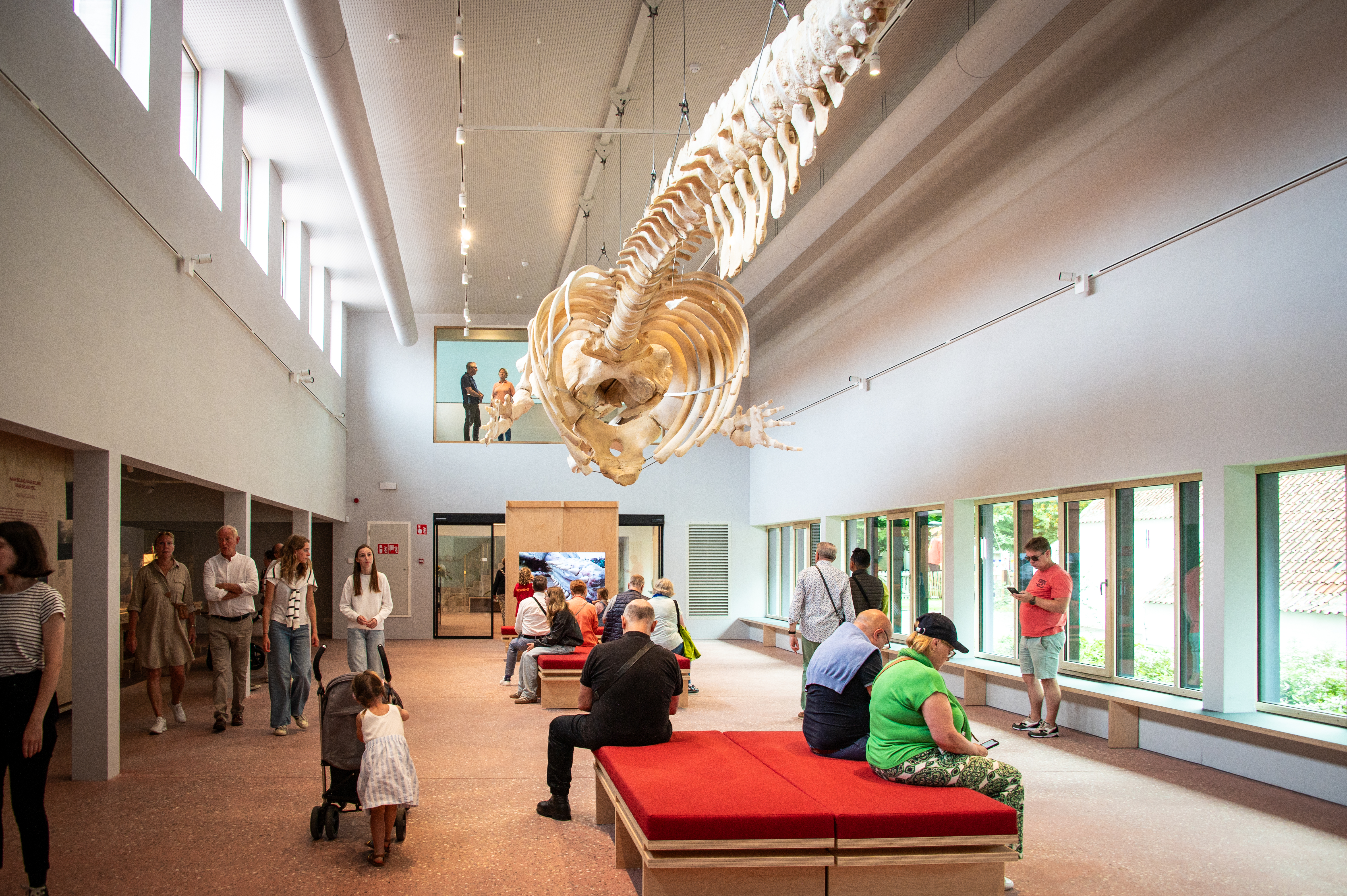 ‘Veel plezier!’, knipoogt museumdirecteur Jadrana Demoen hen toe. Ze neemt me mee naar de eerste zaal waar het indrukwekkende skelet van potvis Valentijn het plafond vult. Links toont een tijdlijn de ups en downs van de kust- en zeevisserij in ons land. Jadrana is opgegroeid in Koksijde-Oostduinkerke. ‘Mijn moeder is hier beginnen gidsen in het jaar dat ik geboren ben. Ze gidst nog altijd. Onze twee grote publiekstrekkers, potvis Valentijn en het vissersschip OD. 1 Martha, zijn personages uit mijn kindertijd.’