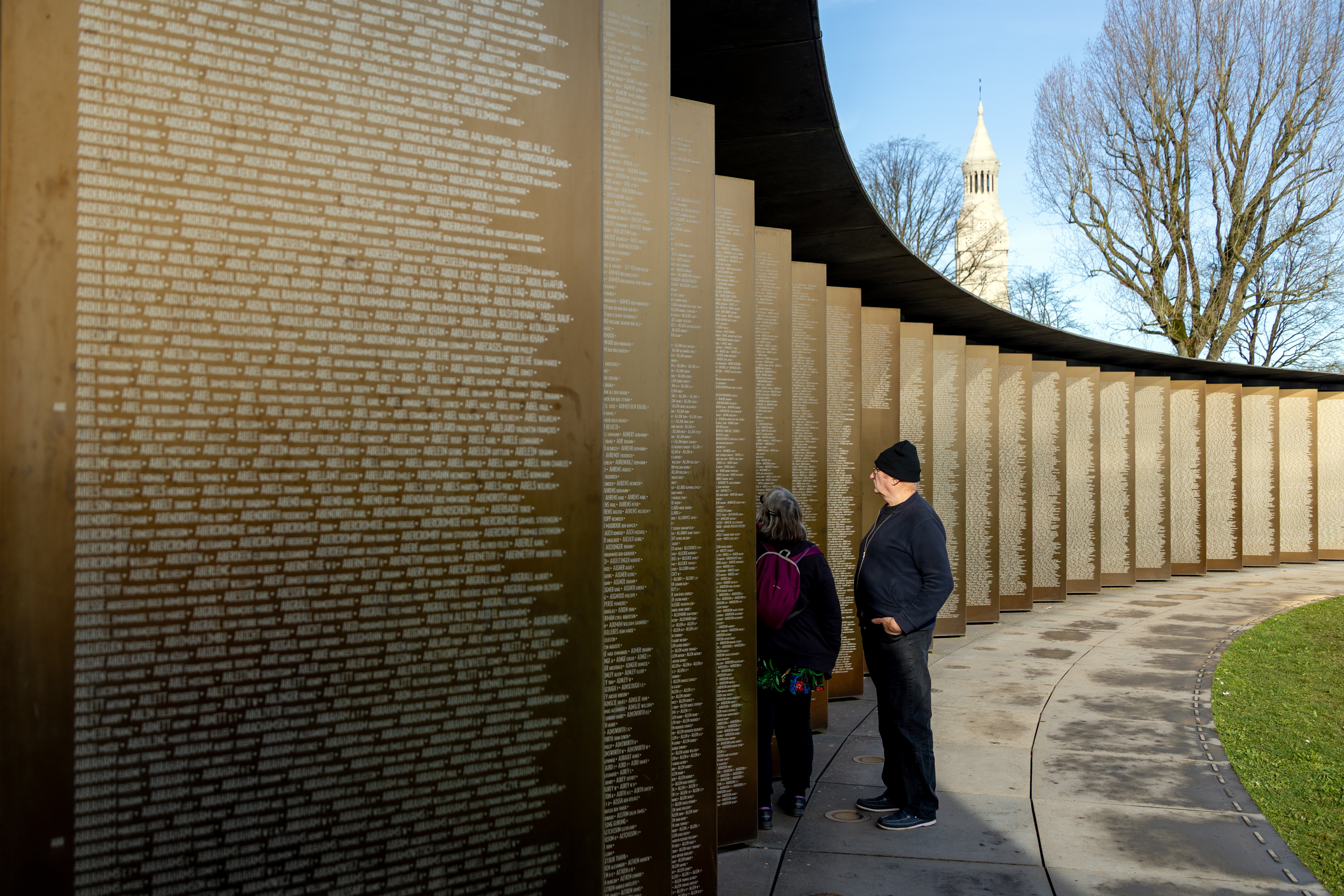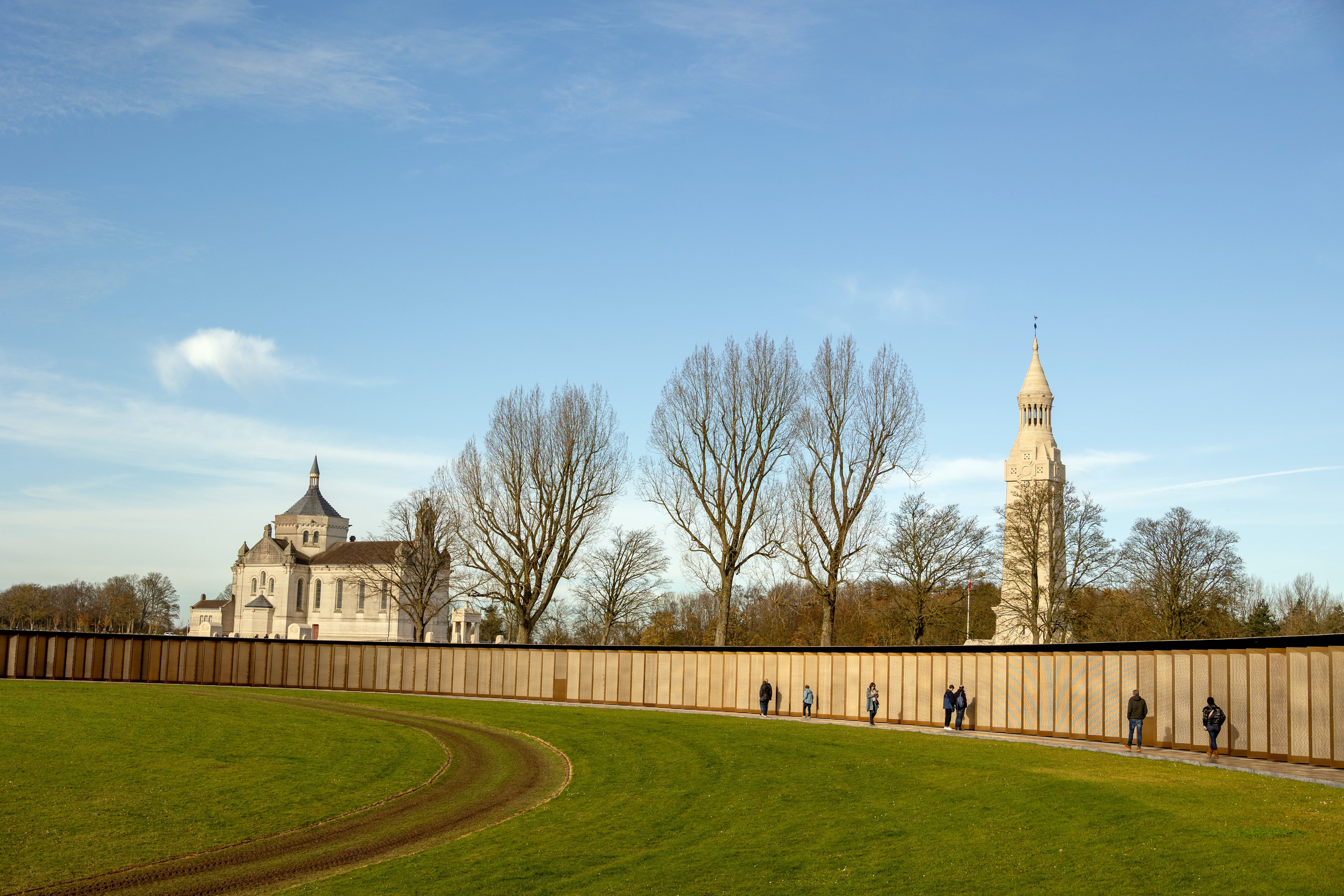 Even verder, op de rand van dezelfde heuvelrug, staat L’Anneau de la Mémoire. Vanop het pad zie je hoe de ring zacht in het landschap is gelegd, boven een vallei die openwaait naar de horizon. De metalen panelen lijken dun, bijna fragiel, maar ze dragen 579.606 namen. Fransen, Duitsers, Britten, Indiërs, Belgen, allemaal alfabetisch naast elkaar, zonder rang, zonder vijandschap. Het is een geometrie van verlies. Hier besef je hoe klein de verschillen zijn die we soms tot oorlog laten uitgroeien. In het licht van die ring valt elke heroïek weg. Oorlog is de waanzin die door mensen werd bedacht en door jongeren werd betaald.