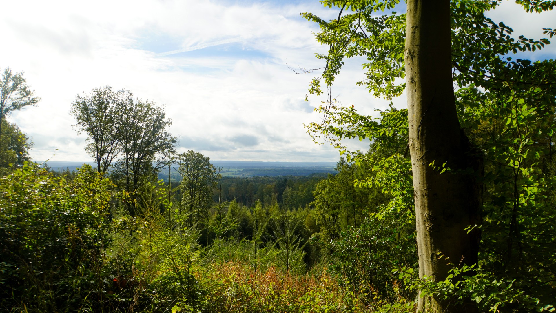 Ik hoopte erop, en ja hoor: het pad volgt de flank van de heuvel, met af en toe openingen tussen de bomen die me een glimp gunnen op de vallei links van me. Wat een festijn voor het oog en hart. Mijn stappen worden vanzelf trager, alsof mijn lichaam de rust van het bos overneemt. Mijn gedachten verweven zich moeiteloos, en zachtjes dwaal ik rond in een lichtmazig web van mogelijkheden.