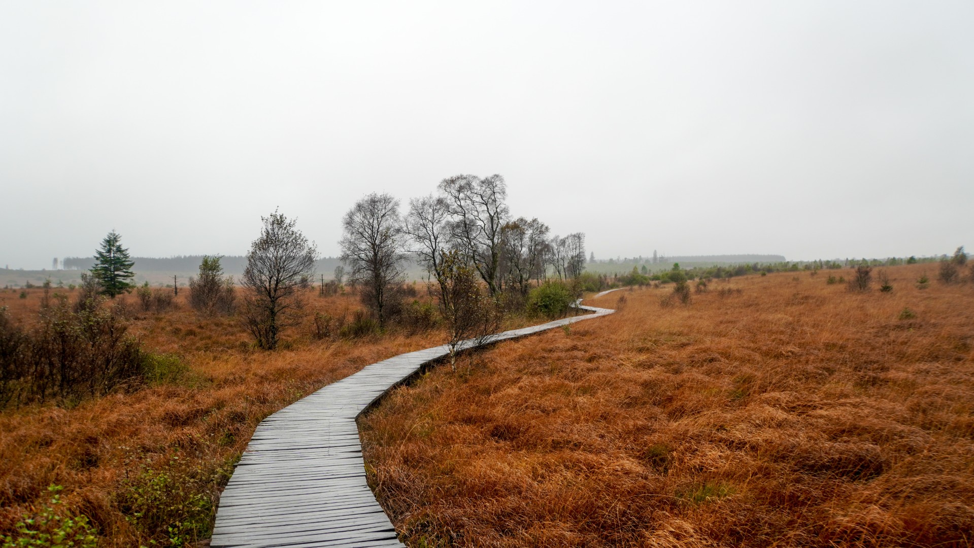 Dat moerassige karakter is meteen duidelijk. Kilometerslange houten vlonderpaden banen zich een weg door het natte landschap. Terwijl ik wandel, dwalen mijn gedachten af naar het bouwproces. Hoeveel maanden, jaren misschien, moet het wel hebben gekost om ze aan te leggen?! De regen en mist maken het plaatje compleet: in een straal van 360 graden om me heen is geen enkel teken van menselijke aanwezigheid te bespeuren, behalve de paden zelf. De eenzaamheid hier voelt bijna buitenaards—een uniek gevoel in ons volgebouwde Belgenland.