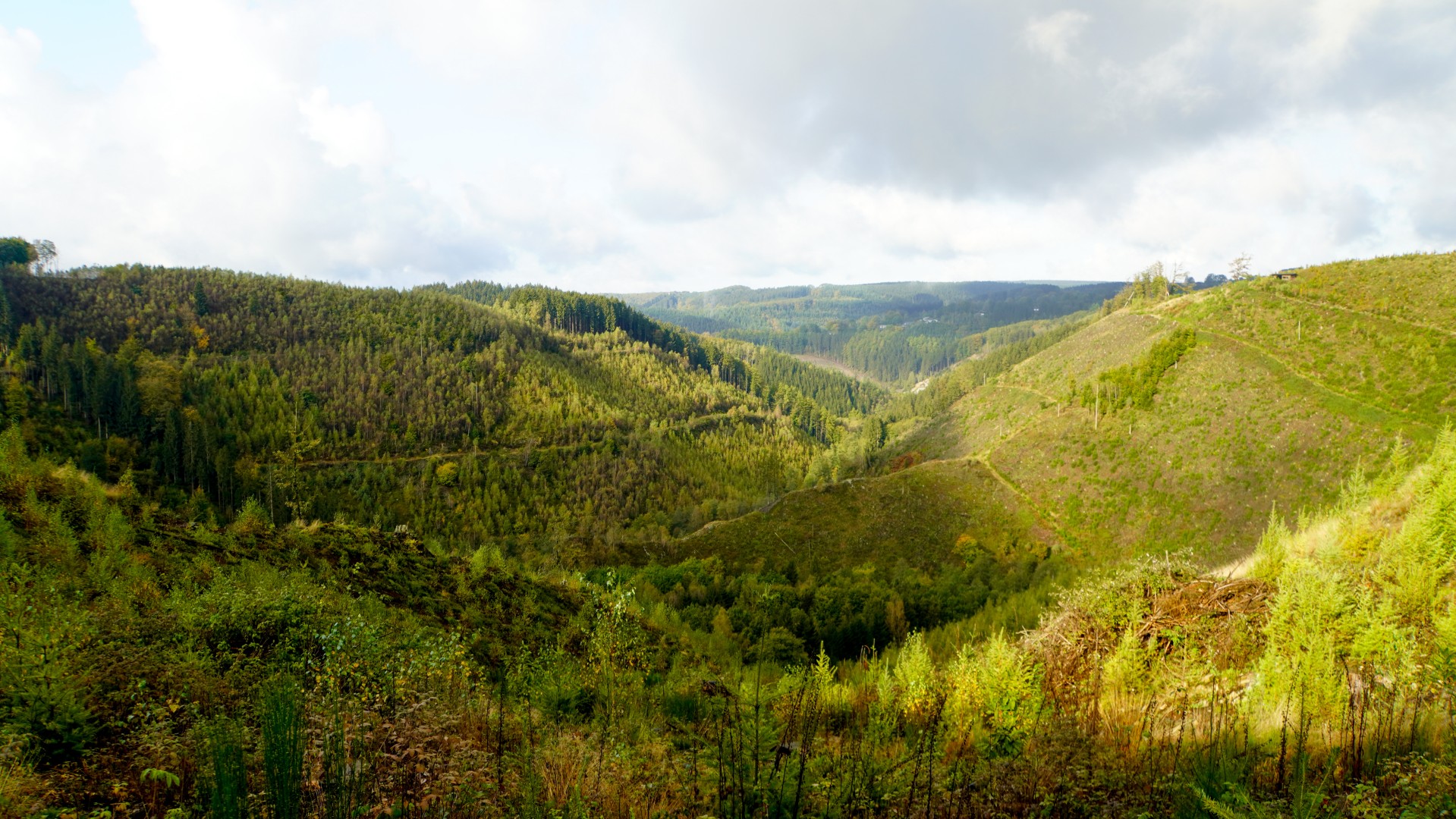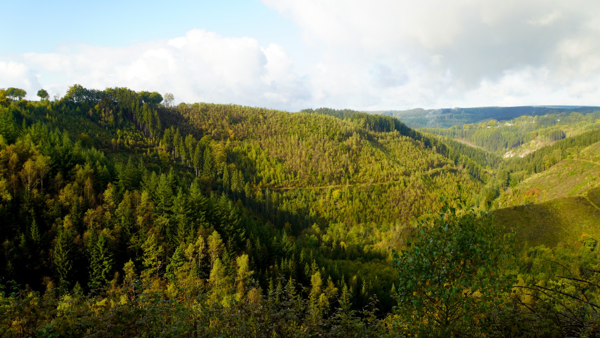 Bij het bestuderen van de kaart valt me op dat deze etappe, ondanks de kortere afstand, behoorlijk wat fysieke inspanning zal vragen. Hier begint het domein van de Zuidelijke Venen, en het pad verplicht je om te stijgen en te dalen. Mijn eerste klim uit Malmedy schudt mijn kuiten wakker, terwijl brede bospaden zich als een kronkelende ader een weg omhoog banen. Al snel bevind ik me op een hoogte waar het uitzicht opent: een uitgestrekte vallei, haar beboste flanken als een mozaïek van herfstkleuren.